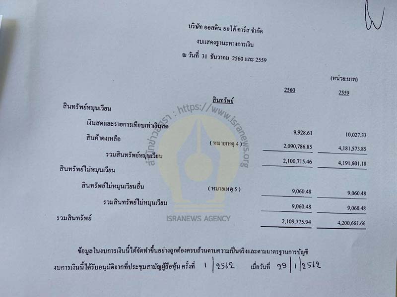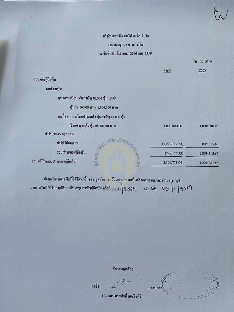 งบดุล สินทรัพย์รวม 2,109,775.94 บาท หนี้สิน 2,408,953.27 บาท ขาดทุนสะสม 1,299,177.33 บาท