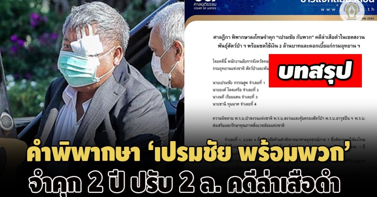 ล่าสุด ศาลจังหวัดทองผาภูมิ อ่านคำพิพากษาศาลฎีกา แก้โทษสั่งจำคุก นายเปรมชัย จาก 2 ปี 14 เดือน เหลือ 2 ปี 6 เดือน ไม่รอลงอาญา , นายยงค์ ลดโทษเหลือจำคุก 2 ปี 9 เดือน ไม่รอลงอาญา และ นายธานี จำคุก 2 ปี 13 เดือน ไม่รอลงอาญา พร้อมให้ร่วมกันชดใช้ค่าเสียหายให้กรมอุทยานแห่งชาติสัตว์ป่าและพันธุ์พืช 2 ล้านบาท