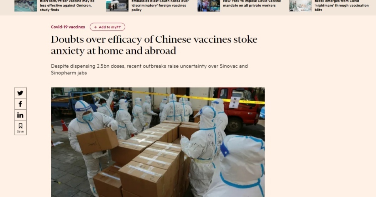 ซึ่งจากกรณีดังกล่าวนั้น ทางด้านของสำนักข่าวไฟแนนเชียลไทม์ ของประเทศอังกฤษได้มีการวิเคราะห์ท่าทีเกี่ยวกับ วัคซีนจากจีน และประเด็นต่างๆอันเกี่ยวกับการระบาดของไวรัสโควิด-19 สายพันธุ์โอไมครอนเอาไว้ในหัวข้อรายงานชื่อว่าความสงสัยที่เพิ่มมากขึ้นกับวัคซีนของประเทศจีนทั้งในประเทศและในต่างประเทศ