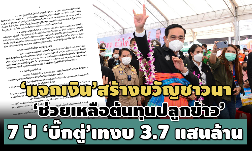 “…ในขณะที่เม็ดเงินที่รัฐบาล ‘กู้’ จากธนาคารเพื่อการเกษตรและสหกรณ์การเกษตร (ธ.ก.ส.) เพื่อนำไปช่วยเหลือเป็นค่าต้นทุนและค่าเก็บเกี่ยวข้าวให้กับชาวนา ก่อนที่จะรัฐบาลตั้งบประมาณมาชำระหนี้ให้กับ ธ.ก.ส. ในปีต่อๆปีนั้น พบว่าในช่วง 7 ปีการผลิต รัฐบาลภายใต้การนำของ พล.อ.ประยุทธ์ ใช้เงินในการช่วยเหลือสูงถึง 371,007 ล้านบาท…”
