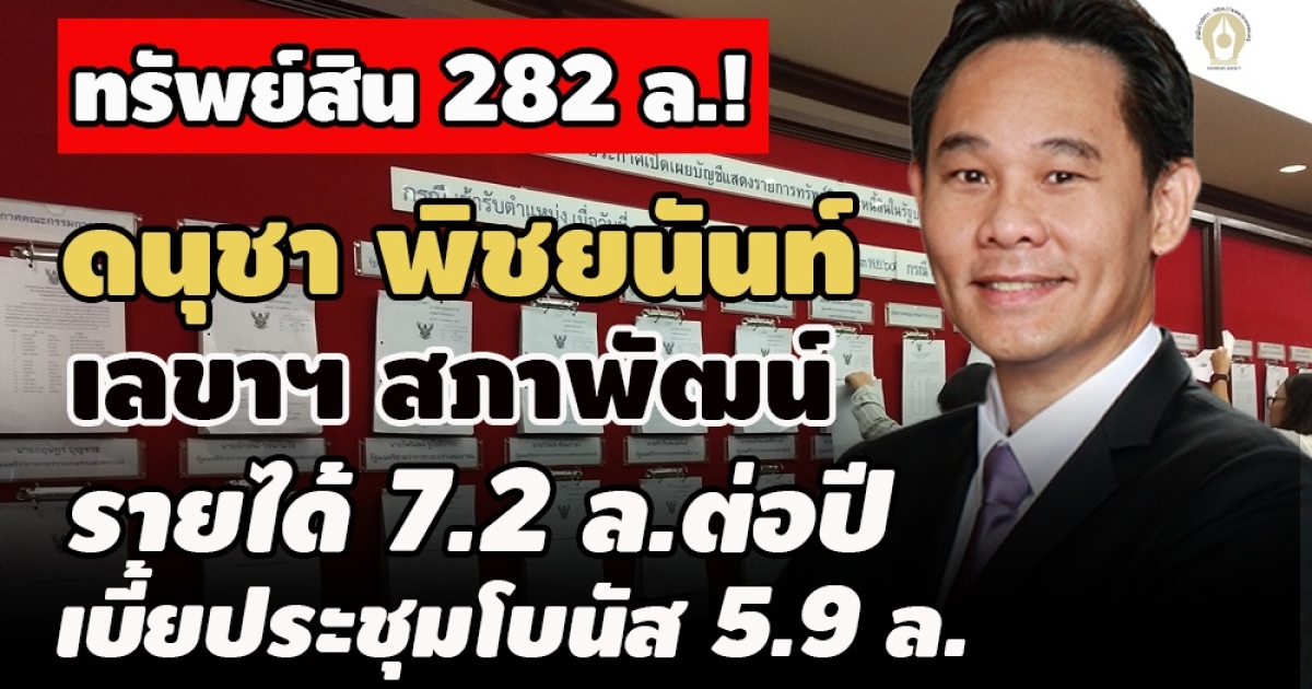 ป.ป.ช.เปิดบัญชีทรัพย์สิน ‘ดนุชา พิชยนันท์’ เลขาฯ สภาพัฒน์ 252.8 ล้านพร้อมภรรยา ที่ดินมูลค่าสูงใน ตลาดขวัญ อ.เมืองนนทบุรี แค่ 3 ไร่ 252.8 ล. หนี้ 7 ล. มีรายได้ 7.2 ล.ต่อปี ค่าเบี้ยประชุมโบนัสเกือบ 6 ล. หลังบ้านมีเครื่องประดับหลายรายการ