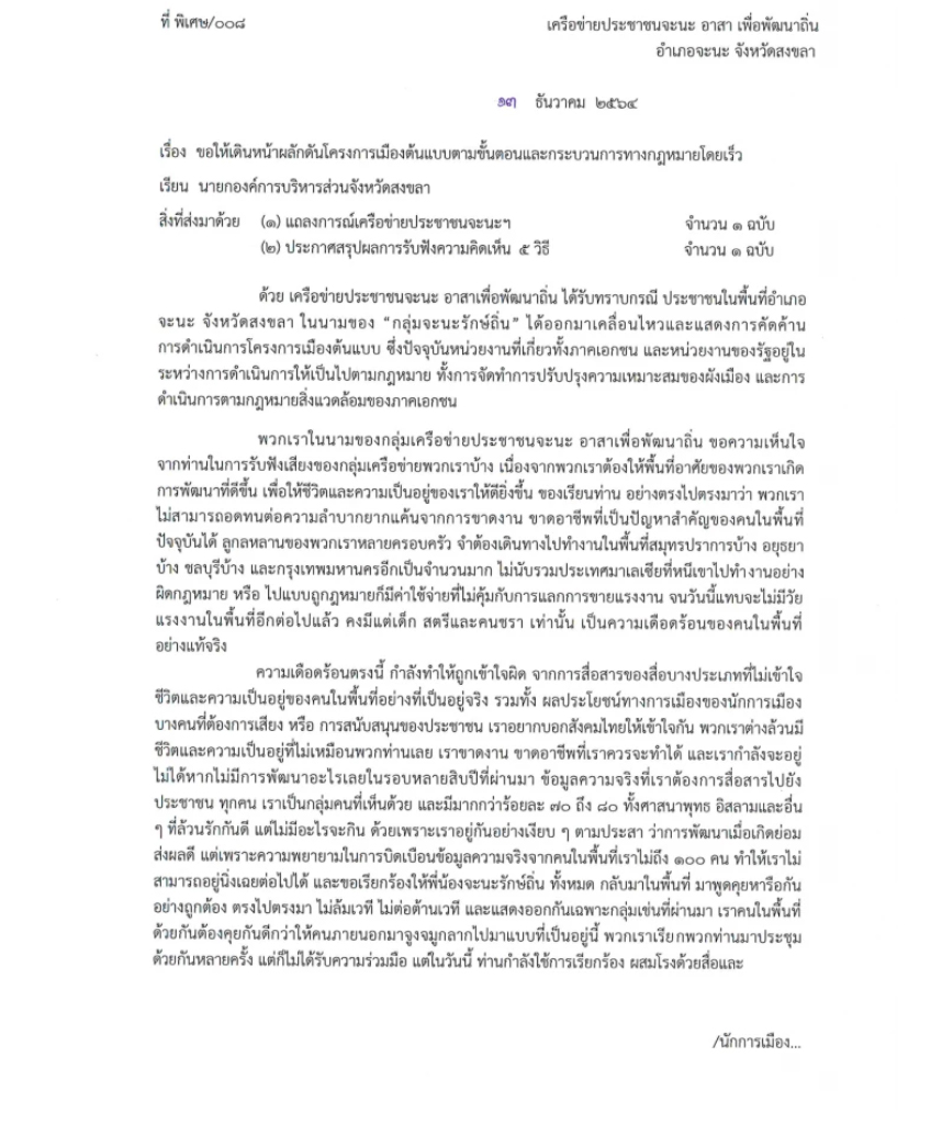 (เครือข่ายประชาชนจะนะอาสาพัฒนาถิ่น ยื่นหนังสือถึงนายก อบจ.สงขลา สนับสนุนให้เดินหน้านิคมอุตสาหกรรมจะนะ เมื่อวันที่ 13 ธ.ค.2564 ที่มาภาพ : อบจ.สงชลา)