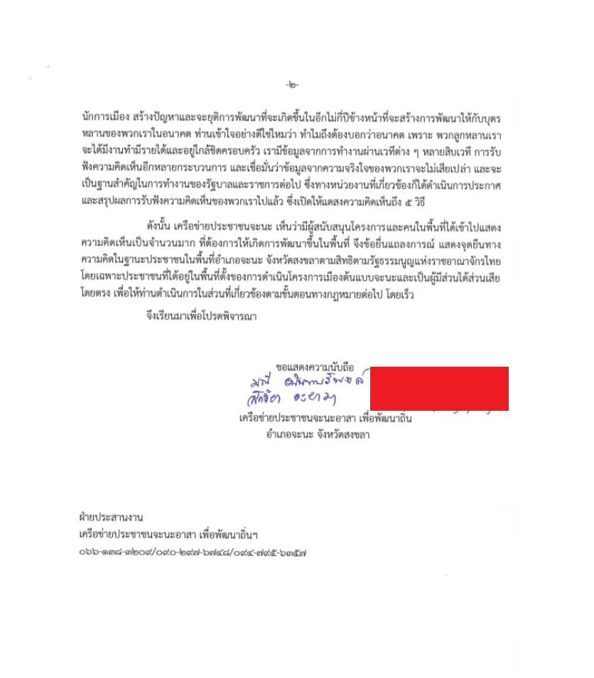 ขณะที่ก่อนหน้านี้ เครือข่ายประชาชนจะนะอาสาพัฒนาถิ่น ยื่นหนังสือต่อ นายกองค์การบริหารส่วนจังหวัดสงขลา ขอให้เดินหน้าโครงการเมืองต้นแบบและนิคมอุตสาหกรรมจะนะ เพื่อพัฒนาคุณภาพชีวิตของประชาชนในพื้นที่ให้ดีขึ้น รวมทั้งได้เข้ายื่นหนังสือถึงพล.อ.ประยุทธ์ จันทร์โอชา นายกรัฐมนตรี ให้สนับสนุนโครงการฯเมื่อวันที่ 14 ธ.ค.ที่ผ่านมาด้วย