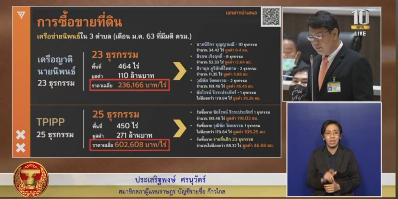 “ราคาซื้อขายต่างกันกว่าเท่าตัว มีส่วนต่าง 170 ล้านบาท โดยเป็นการซื้อที่ดินจากกลุ่มคนใกล้ชิดนายนิพนธ์ ไม่ใช่ซื้อจากชาวบ้านในราคาสูง หากในอนาคตเกิดนิคมอุตสาหกรรมขึ้นจริง มูลค่าที่ดินของบริษัทจะสูงขึ้นอีกหลายเท่าตัว” ประเสริฐพงษ์ อภิปรายเมื่อวันที่ 18 ก.พ.2564 (อ่านประกอบ : จัดหนัก "จะนะ" ก้าวไกลปะทะ มท.2)
