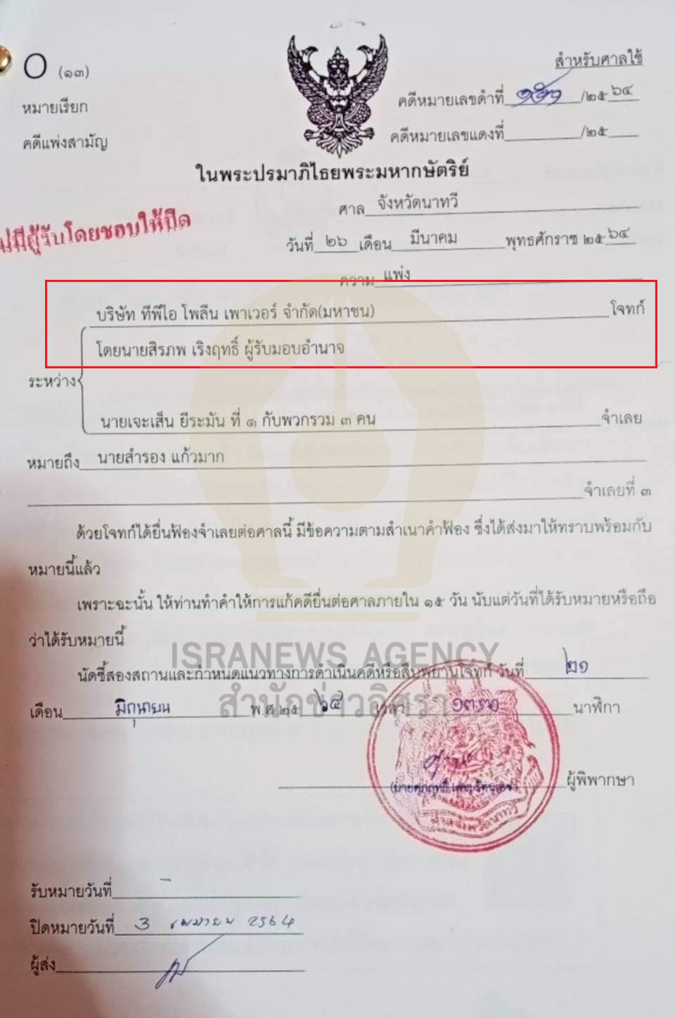 และเมื่อไม่นานมานี้ สิรภพ ได้รับมอบอำนาจจาก บริษัท ทีพีไอ โพลีน เพาเวอร์ จำกัด (มหาชน) หรือ TPIPP เป็นโจทก์ยื่นฟ้อง เจะเส็น ยีระมัน และชาวบ้านอีก 2 ราย เป็นจำเลย โดยขอให้ศาลจังหวัดนาทวีสั่งขับไล่จำเลยทั้ง 3 ออกจากที่ดิน น.ส.3 ก. เลขที่ 437 เลขที่ดิน 81 ต.บ้านนา อ.จะนะ จ.สงขลา เนื้อที่ 28 ไร่ 3 งาน 85.2 ตารางวา
