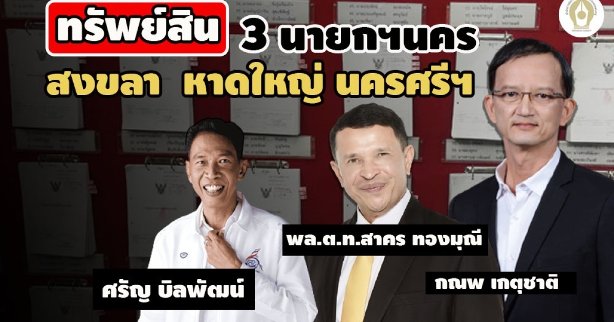 ข้อมูลบัญชีทรัพย์สิน 3 นายกเทศมนตรีนคร นครสงขลา หาดใหญ่ นครศรี ฯ : พล.ต.ท.สาคร ทองมุณี คู่สมรส มากสุด 73.8 ล. ภรรยาเงินฝาก 28.2 ล. ส่วน‘ศรัญ บิลพัฒน์’ น้อยสุด 4.4 ล้าน แจ้งสถานภาพหย่าเมีย ขณะ ‘กณพ เกตุชาติ’ 54.7 ล้าน รวมภรรยานอกสมรส ถือหุ้น 5 บริษัท ให้กู้บริษัทตัวเอง 2 แห่ง 25 ล.