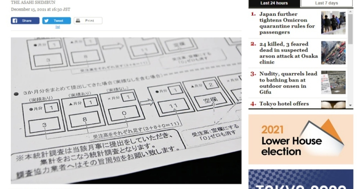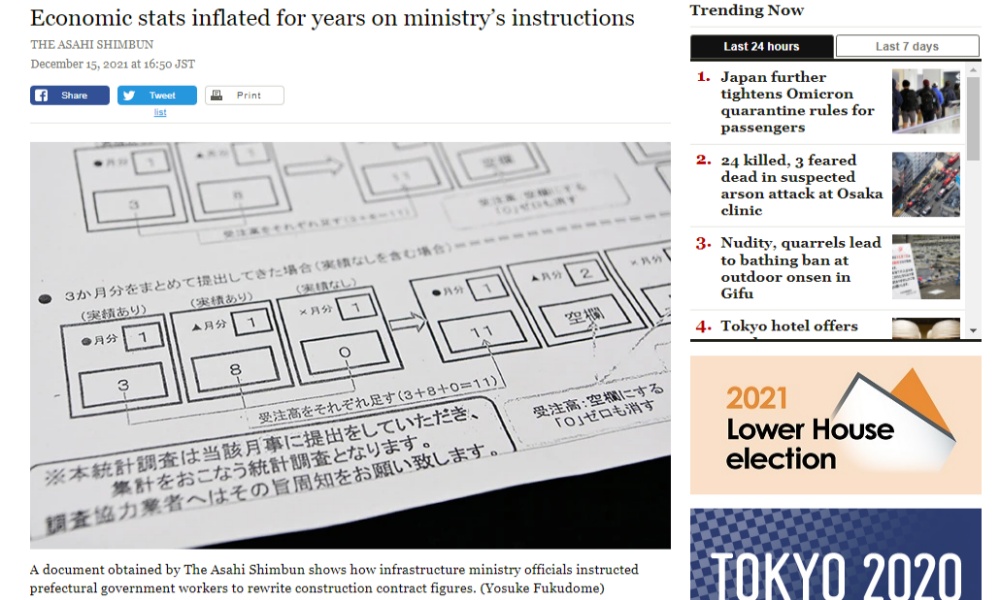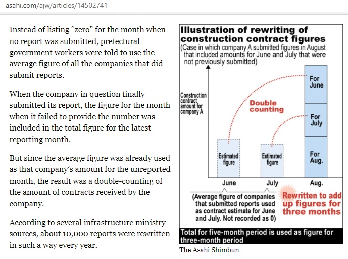 โดยสำนักข่าวอาซาฮี ชิมบุนของประเทศญี่ปุ่นได้จัดทำรายงานข่าวสืบสวนระบุถึงกรณีที่ กระทรวงด้านโครงสร้างพื้นฐานหรือชื่อเต็มว่ากระทรวงที่ดินโครงสร้างพื้นฐานการขนส่งและการท่องเที่ยวได้ออกคำสั่งไปยังเจ้าหน้าที่ของหน่วยงานปกครองส่วนท้องถิ่นประเทศญี่ปุ่นให้ดำเนินการเพิ่มตัวเลขสัญญาการก่อสร้างที่สูงจนเกินจริงเป็นระยะเวลาถึง 8 ปีด้วยกัน ซึ่งการกระทำดังกล่าวนั้นอาจจะเป็นการกระทำผิดต่อกฎหมายและเป็นการบิดเบือนข้อมูลทางเศรษฐกิจของประเทศญี่ปุ่น
