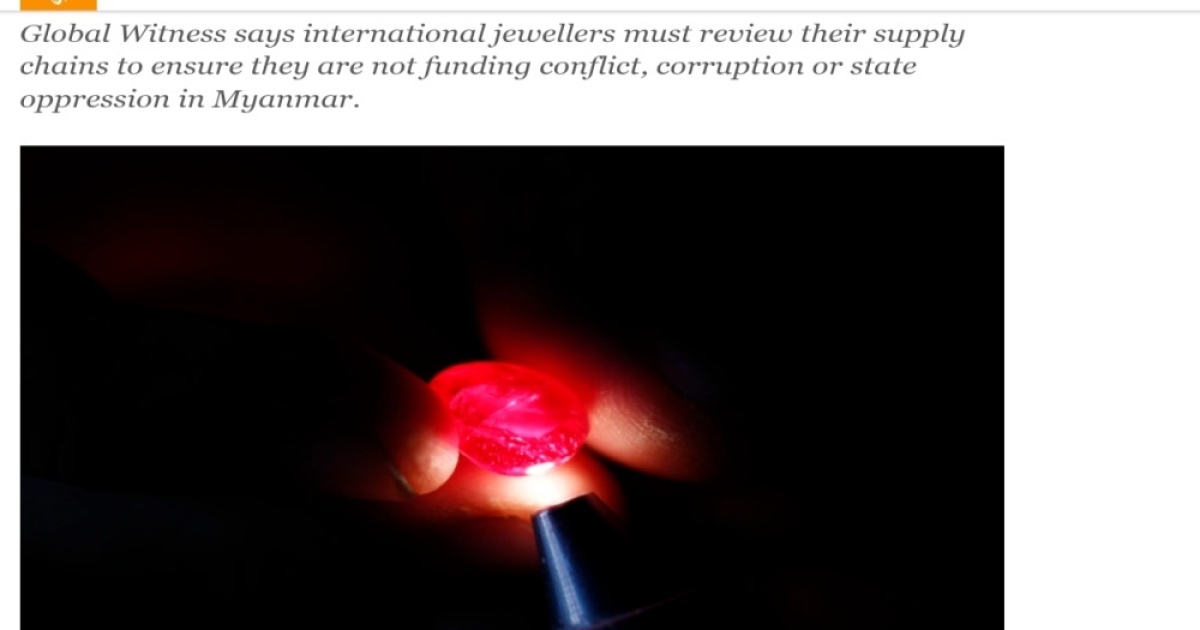 สำนักข่าวอัลจาซีร่า ระบุว่า เครือข่ายการต่อต้านการทุจริตได้มีการประกาศคำเตือนให้กลุ่มผู้ค้าอัญมณีทั่วโลกนั้นได้เฝ้าระแวดระวังความเป็นไปได้ที่บทบาทของพวกเขานั้นจะกลายเป็นการสนับสนุนการละเมิดสิทธิมนุษยชนในประเทศเมียนมา ซึ่งอุตสาหกรรมด้านการค้าอัญมณีมูลค่าสูงของประเทศกลายเป็นแหล่งรายได้สำคัญของกลุ่มผู้นำเผด็จการทหารเมียนมา