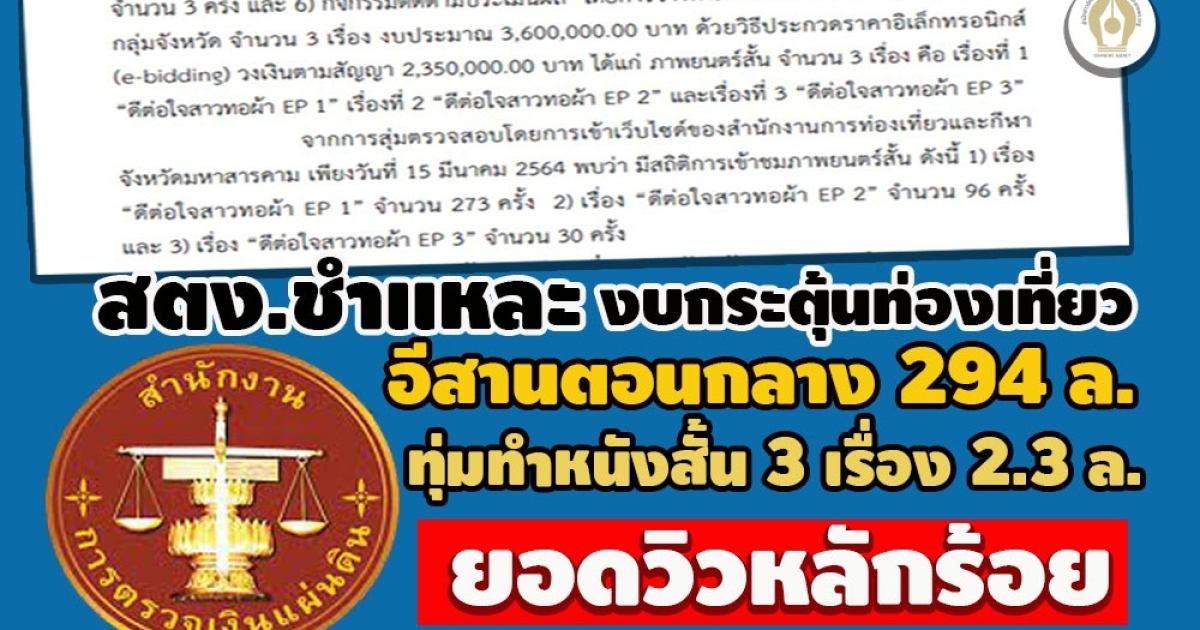 การใช้จ่ายเงินงบประมาณตามแผนพัฒนาเพิ่มศักยภาพการท่องเที่ยวอย่างครบวงจร ประจำปีงบประมาณ พ.ศ. 2561-2563 ของกลุ่มจังหวัดภาคตะวันออกเฉียงเหนือตอนกลาง วงเงินรวมกว่า 294,299,330 บาท ถูกสำนักงานการตรวจเงินแผ่นดิน (สตง.) ตรวจสอบพบว่า ผลการดำเนินงานยังไม่มีประสิทธิภาพ บางโครงการไม่เกิดผลสัมฤทธิ์เพียงพอ ขณะที่ในการจัดกิจกรรมค่าจ้างทำภาพยนตร์โฆษณาการท่องเที่ยวในกลุ่มจังหวัด ใช้งบประมาณกว่า 2.3 ล้าน ทำหนังสั้น 3 เรื่อง แต่มียอดคนดูหลักสิบหลักร้อย