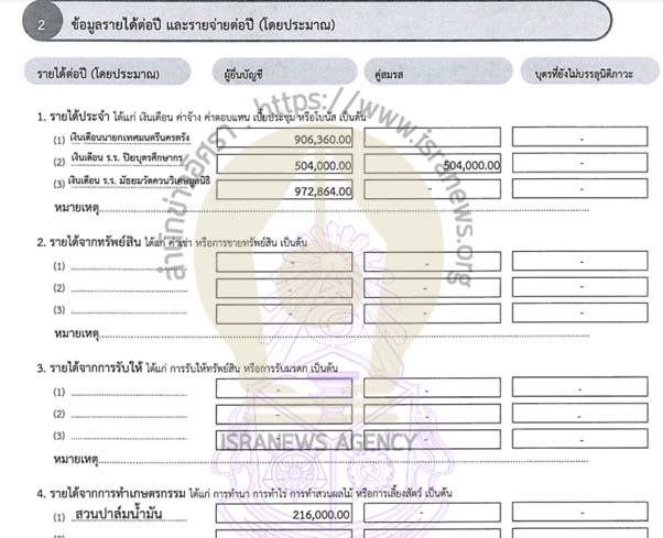 รายได้ 2,091,510.26 บาท (รายได้ประจำ ค่าตอบแทนประจำตำแหน่ง,ค่าตอบแทนพิเศษ ,เงินโบนัส) คู่สมรส 360,000 บาท (รายได้ประจำ-เงินเดือน) รายจ่าย 1,190,398 บาท คู่สมรส 1,322,620 บาท
