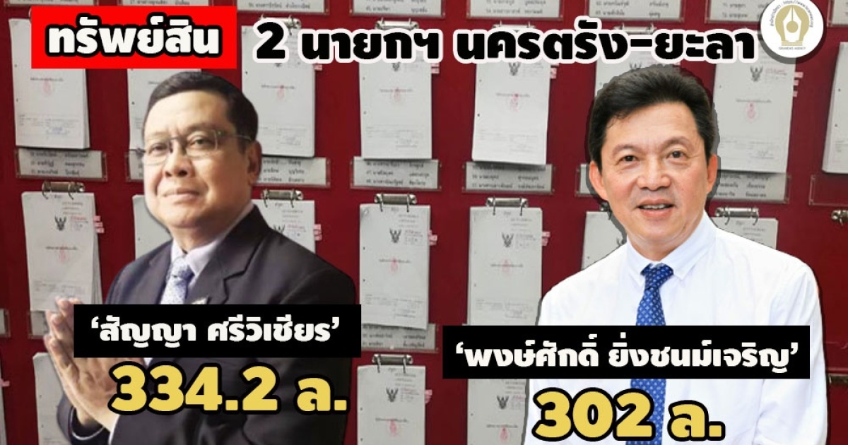 เปิดทรัพย์สิน 2 นายกเทศมนตรีนครตรัง ‘สัญญา ศรีวิเชียร’ 334.2 ล้าน เจ้าของโรงเรียนเอกชน เงินฝาก 22.6 ล้าน ‘พงษ์ศักดิ์ ยิ่งชนม์เจริญ’ นายกเทศฯนครยะลา 302 ล.รวมภรรยานอกสมรส ที่ดิน 235 แปลง กระเป๋าหรู 5 ใบ นาฬิกาเรือนละ 2 ล้าน