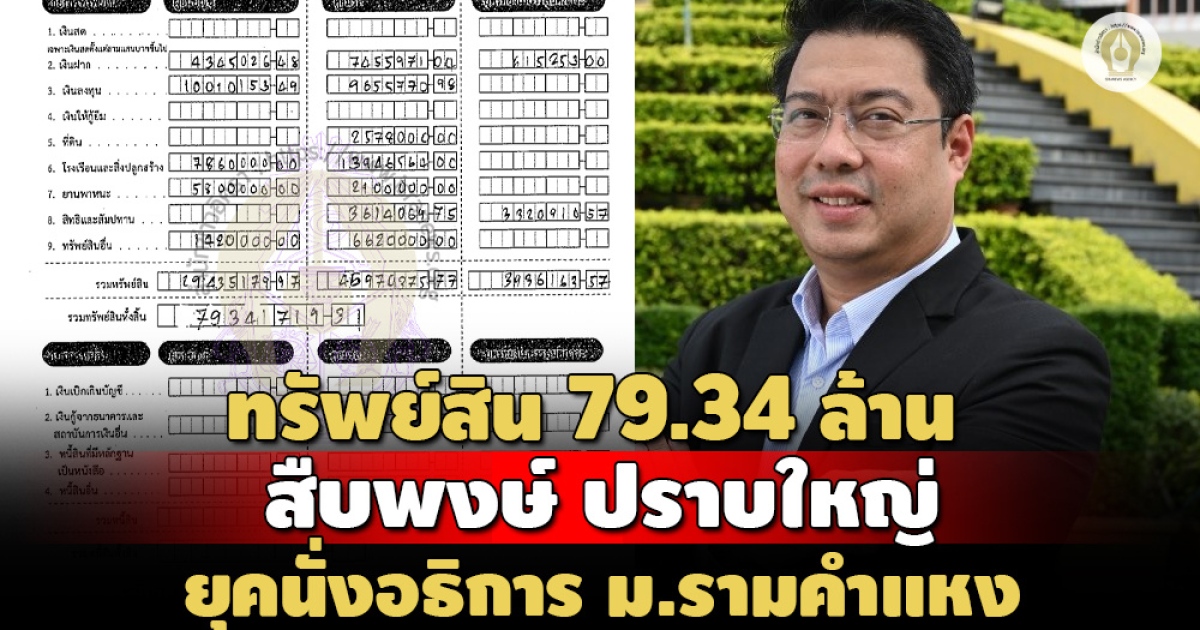 ก่อนสภามหาวิทยาลัยมีมติถอดถอนพ้นตำแหน่ง เปิดทรัพย์สิน 79 ล้านบาท 'สืบพงษ์ ปราบใหญ่' ยุคนั่งอธิการบดี ม.รามคำแหง เฉพาะภรรยา 45 ล้านบาท เงินฝาก 32 บัญชี เงินลงทุน 22 รายการ รายได้ต่อปีรวมกัน 1.1 ล้านบาทต่อปี รายจ่าย 8.5 แสนบาทต่อปี