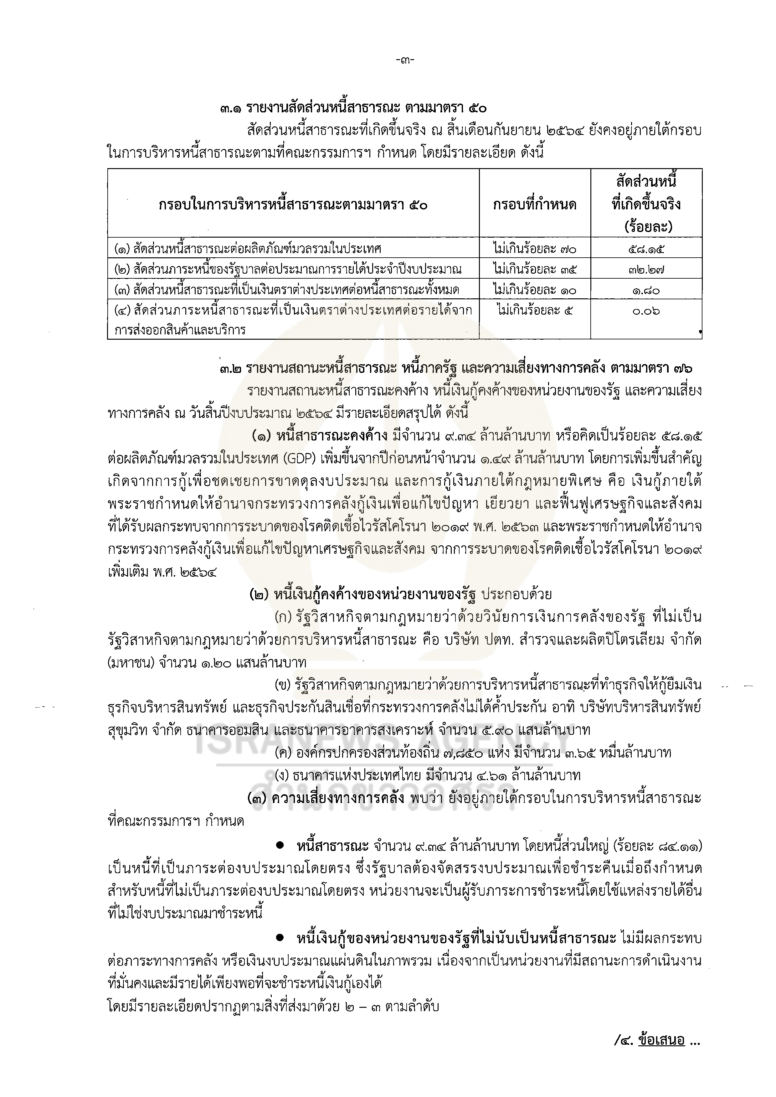 "...ข้อมูลล่าสุด ณ เดือน ก.ย.2564 ยอดหนี้สาธารณะของไทยอยู่ที่ 9.34 ล้านล้านบาท คิดเป็น 58.15% ต่อ GDP เพิ่มขึ้นจากปีก่อนหน้า 1.49 ล้านล้านบาท โดยสาเหตุที่เพิ่มขึ้นเกิดจากการกู้เพื่อชดเชยการขาดดุลงบประมาณ และการกู้เงินภายใต้กฎหมายพิเศษ 2 ฉบับ..."