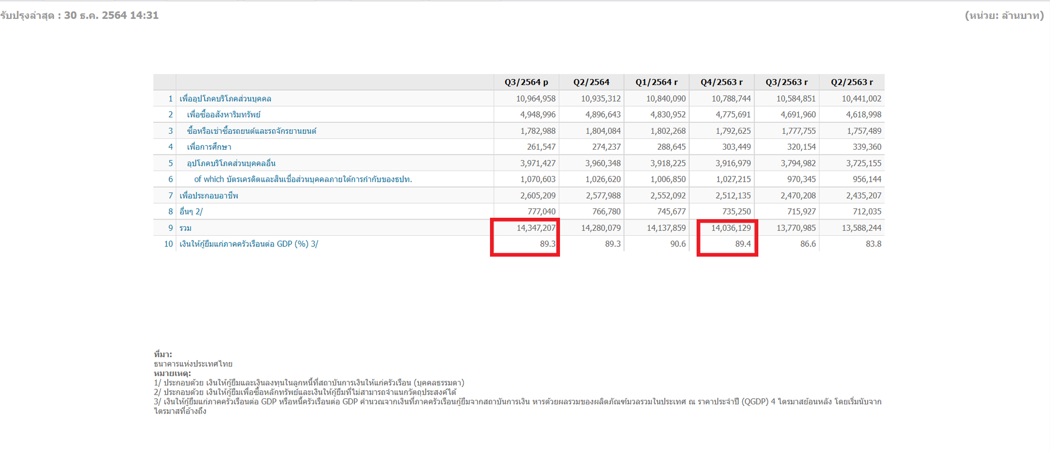 ส่วนสถานะ ‘หนี้สินครัวเรือน’ นั้น ข้อมูลล่าสุดจากของธนาคารแห่งประเทศไทย (ธปท.) ระบุว่า ณ ไตรมาส 3/2564 (30 ก.ย.2564) ครัวเรือนไทยมีหนี้สินทั้งสิ้น 14.34 ล้านล้านบาท หรือคิดเป็น 89.3% ต่อ GDP เทียบกับ ณ สิ้นไตรมาส 4/2563 ที่ครัวเรือนไทยมีหนี้สิน 14.03 ล้านล้านบาท หรือคิดเป็น 89.4% ต่อ GDP
