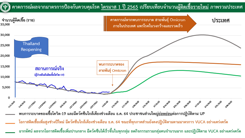 นพ.โอภาส เปิดเผยเพิ่มเติมว่า ถ้ากลับมาดูการคาดการณ์สถานการณ์การระบาดของโควิดหลังปีใหม่ กระทรวงสาธารณสุขเคยคาดการณ์ไว้ว่าจะมีการกระจายตัวของผู้ติดเชื้อมากขึ้น โดยเฉพาะสายพันธุ์โอไมครอน และยังคาดการณ์สถานการณ์ที่เลวร้ายที่สุดไปถึงการพบผู้ติดเชื้อสูงสุด 30,000 รายต่อวันในอีก 1-2 เดือนข้างหน้า