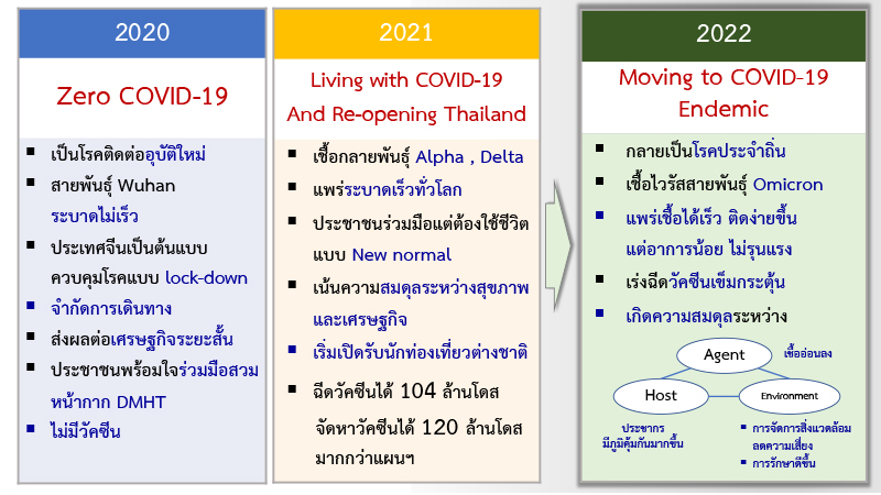 ปี 2020 โควิดเป็นโรคอุบัติใหม่ ไทยได้เรียนรู้วิธีการควบคุมโรคมาจากจีน คือ การควบคุมโรคแบบล็อกดาวน์ จำกัดการเดินทาง รวมทั้งประชาชนให้ความร่วมมือในการสวมหน้ากากอนามัย ซึ่งขณะนั้นยังไม่มีวัคซีน ส่งผลต่อระบบเศรษฐกิจในระยะสั้น