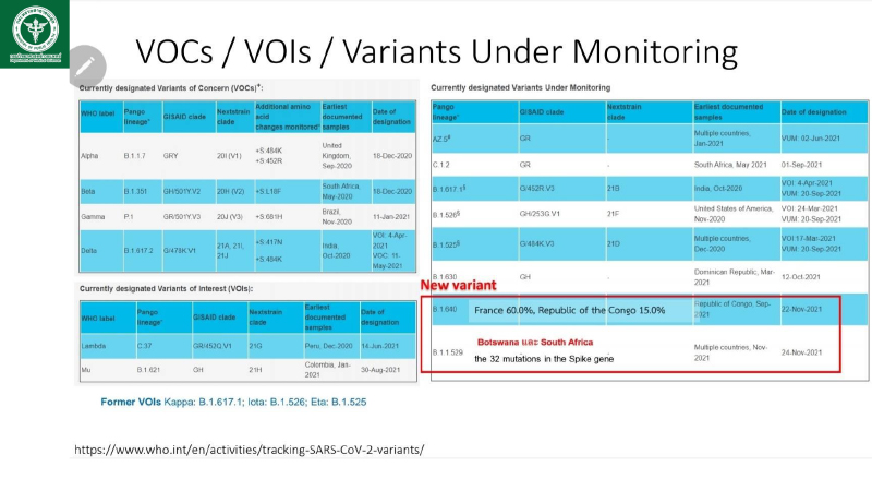 และสายพันธุ์ B.1.640.2 ที่เจอในฝรั่งเศส โดยมีต้นทางมาจากคองโก พบผู้ป่วยสายพันธุ์นี้แล้วกว่า 400 ราย นอกจากนี้ยังมีการกลายพันธุ์ยอง Spike Protein และมีการขาดหายไปอีก 9 ตำแหน่ง ที่สำคัญเจอ N501Y และ E484Q บ่งบอกให้เห็นความสามารถในการหลบหลีกภูมิคุ้มกันจากวัคซีน