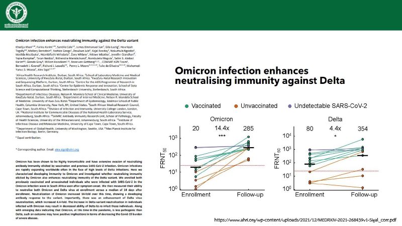 “…แอฟริกาใต้ได้ศึกษาภูมิต้านทานของผู้ป่วยโอไมครอน พบว่าผู้ป่วยจะมีภูมิต้านทานต่อเชื้อโอไมครอนได้ถึง 14-15 เท่า ขณะเดียวกันก็มีภูมิคุ้นกันต่อเดลต้าได้ด้วยราว 4 เท่า แสดงให้เห็นว่าการป่วยโอไมครอนไม่ได้มีผลร้ายอย่างเดียว อย่างไรก็ตามเน้นย้ำว่าไม่แนะนำให้ทุกคนไปรับเชื้อโอไมครอนเพื่อกระตุ้นภูมิคุ้มกันแทนการฉีดวัคซีน ทั้งนี้กรมวิทยาศาสตร์การแพทย์จะรวบรวมผู้ป่วยโอไมครอนในไทย เพื่อนำมาตรวจเลือดหาภูมิคุ้มกันต่อไปว่าจะจัดการกับโควิดสายพันธุ์เดลต้าได้มากน้อยเพียงใด…”