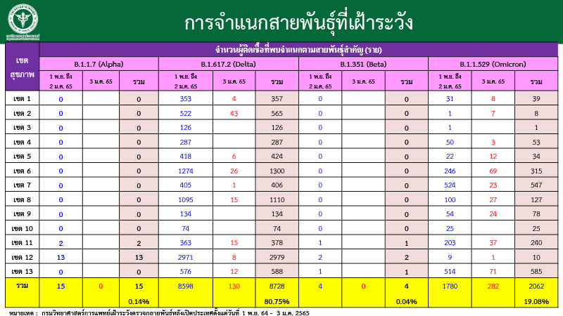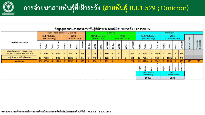 โดย นพ.ศุภกิจ ศิริลักษณ์ อธิบดีกรมวิทยาศาสตร์การแพทย์ ได้เปิดเผย สำนักข่าวอิศรา (www.isranews.org) ถึงสถานการณ์การระบาดของโอไมครอนภายในประเทศไทยว่า จากการติดตามผู้ติดเชื้อโอไมครอนตั้งแต่วันที่ 1 พ.ย. 2564 - 3 ม.ค. 2565 พบผู้ป่วยสะสม 2,062 ราย
