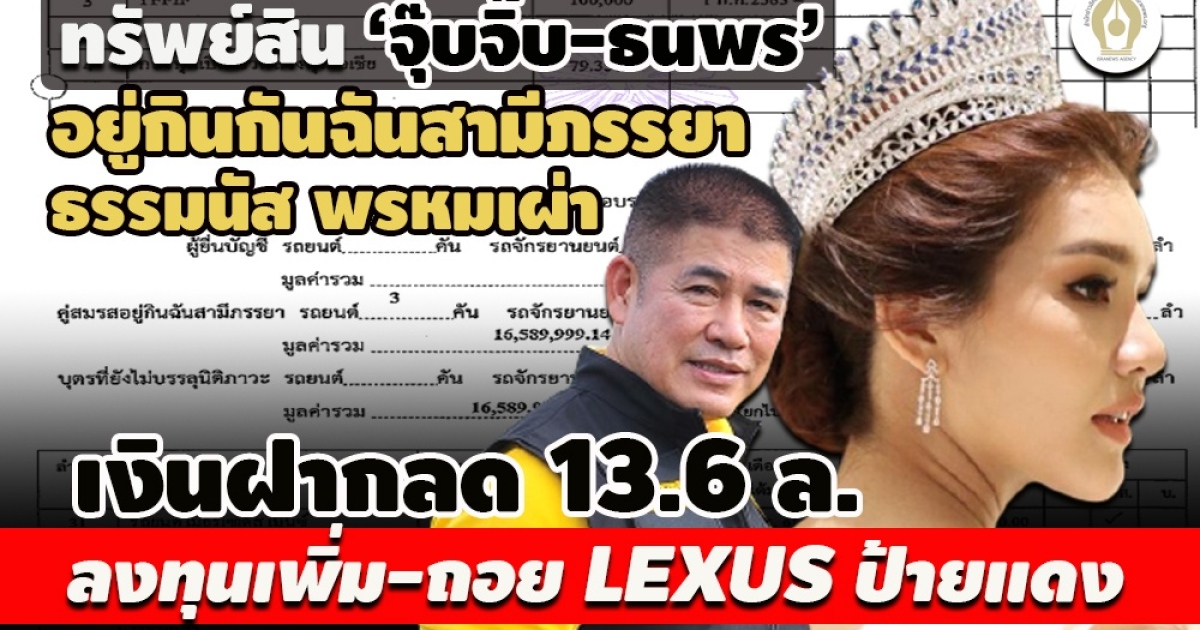 จาระไนทรัพย์สิน ‘จุ๊บจิ๊บ-ธนพร’ ขรก.การเมือง สถานะอยู่กินฉันสามีภรรยา ‘ธรรมนัส พรหมเผ่า’ แจ้งป.ป.ช. ครั้งล่าสุด 55.9 ล. จากเดิม 63.6 ล.ปี 2562 ลดลง 7.7 ล. พบเงินฝากวูบ 13.6 ล. แต่ 4 ประเภท ทั้งเงินลงทุน รถยนต์เลกซัสป้ายแดง สิทธิสัมปทาน ทรัพย์สินอื่น เพิ่มขึ้น