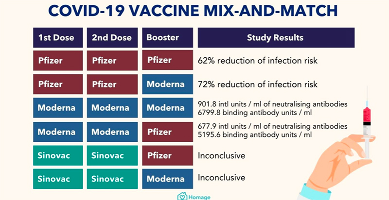การฉีดวัคซีนเข็มกระตุ้นสามารถ ‘ผสมและจับคู่’ ได้ เพื่อให้สอดคล้องกับการฉีดวัคซีนในแต่ละพื้นที่ โดย นพ.อโศก คูรุป จากสถาบันการแพทย์โรคติดเชื้อในประเทศสิงคโปร์ให้เหตุผลว่า วิธีฉีดวัคซีนแบบผสมนี้ จะช่วยกระตุ้นระบบภูมิคุ้มกันหลายรูปแบบได้ มีรายละเอียดดังนี้