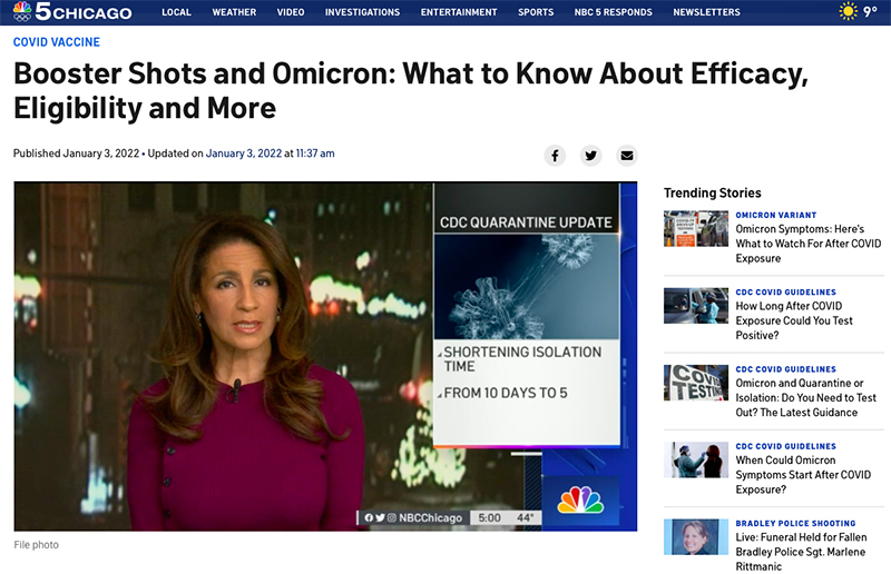เว็บไซต์ NBC Chicago เปิดเผยว่า หน่วยงานด้านสุขภาพเชื่อว่าการจะต่อสู้กับโควิดสายพันธุ์โอไมครอนได้ อาจต้องการภูมิคุ้มกันที่สูงจากวัคซีนเข็มกระตุ้น แม้ว่าขณะนี้จะพบการติดเชื้อของบุคคลที่ได้รับวัคซีนครบ 2 เข็ม หรือรับวัคซีนเข็มกระตุ้นแล้วก็ตาม แต่กลุ่มที่ได้รับวัคซีนแล้ว ส่วนใหญ่จะมีอาการป่วยรุนแรงน้อยกว่ากลุ่มที่ยังไม่ได้รับวัคซีน