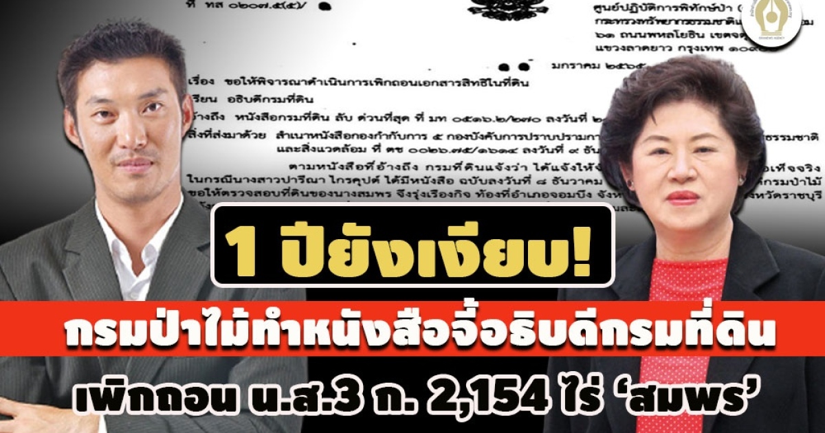 ไม่คืบหน้า ปม น.ส.3 ก. 2,154 ไร่ ‘สมพร-ชนาพรรณ-ธนาธร จึงรุ่งเรืองกิจ’ คดีรุกป่า จ.ราชบุรี กรมป่าไม้ทำหนังสือจี้อธิบดีกรมที่ดินเพิกถอนเอกสารสิทธิ์หลังผ่านไป 1 ปีไม่แจ้งผล ‘ชีวะภาพ ชีวะธรรม’ผอ.ศูนย์ปฏิบัติการพิทักษ์ป่า รับสอบถามจริง เหตุพนักงานสอบสวนสอบถามมาอีกทอด เป็นกระบวนการปกติของราชการ ทำไปตามข้อเท็จจริง
