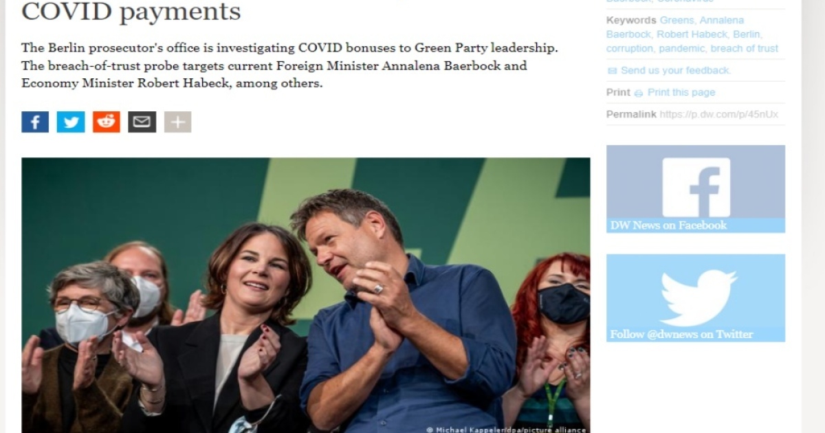 โดยเมื่อประมาณวันที่ 19 ม.ค. ที่ผ่านมา สำนักข่าวต่างประเทศหลายแห่งได้รายงานข้อมูลอันมีที่มาจากการรายงานข่าวของนิตยสารข่าวเดอร์ สปีเกลของเยอรมนีว่า สำนักงานอัยการกรุงเบอร์ลิน ณ เวลานี้ได้ดำเนินการสืบสวนผู้บริหารรัฐบาลกลางที่เป็นสมาชิกระดับบริหารของพรรคกรีนส์จำนวน 6 คนด้วยกัน ซึ่งในจำนวนดังกล่าวนั้นยังรวมไปถึงผู้นำพรรคกรีนส์จำนวน 2 ราย ได้แก่นายโรเบิร์ต ฮาเบ็ค รองนายกรัฐมนตรีและรัฐมนตรีว่าการกระทรวงเศรษฐกิจและการดำเนินการด้านสภาพภูมิอากาศ และนางแอนนาเลนา แบร์บ็อก รัฐมนตรีว่าการกระทรวงต่างประเทศของเยอรมนี