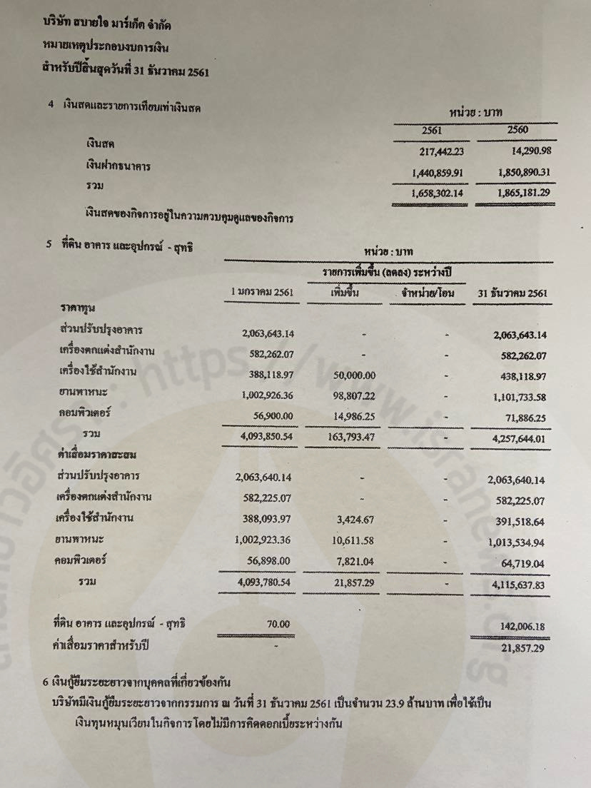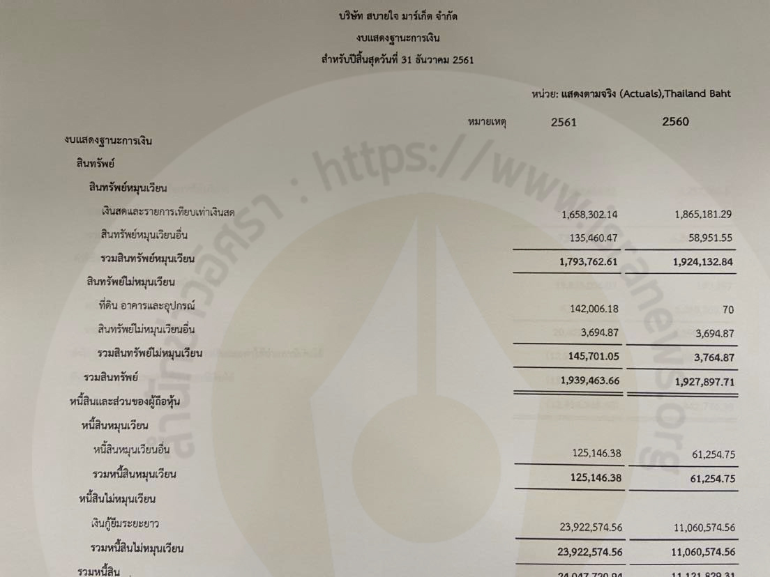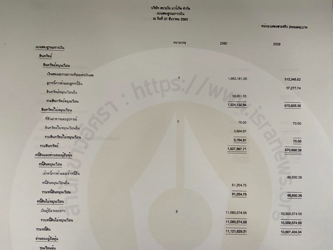 มีหนี้สินรวม 122,778.20 บาท ไม่มีหนี้เงินกู้ยืมจากกรรมการ แต่มี 'เงินให้กู้ยืมระยะยาวจากบุคคลที่เกี่ยวข้อง' เป็นเงินให้กรรมการกู้ยืมจำนวน 2,430,000 บาท โดยคิดดอกเบี้ยในอัตรา 1% ต่อปี