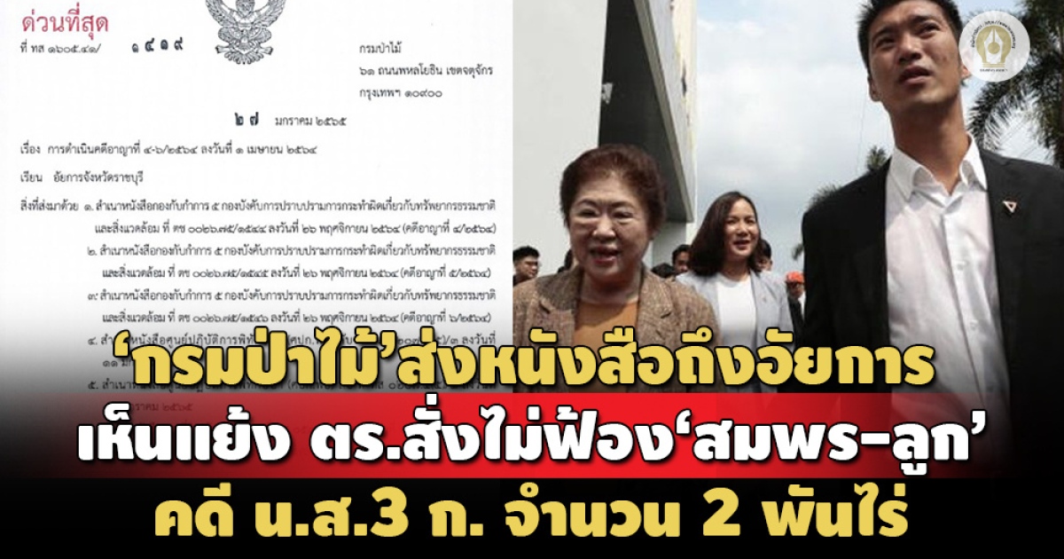 “ด้วยกรมป่าไม้ได้รับหนังสือจากกองกํากับการ 5 กองบังคับการปราบปรามการกระทําความผิด เกี่ยวกับทรัพยากรธรรมชาติและสิ่งแวดล้อม แจ้งว่า ได้ทําการสอบสวนเสร็จสิ้นแล้ว และเมื่อ 16 พฤศจิกายน 2564 ได้ส่งสํานวนการสอบสวนไปยังพนักงานอัยการจังหวัดราชบุรี โดยมีความเห็นควรสั่งไม่ฟ้องผู้ต้องหา ตามฐานความผิด ในคดีอาญาที่ 4-6/2564 รายนางสมพร จึงรุ่งเรืองกิจ นางชนาพรรณ จึงรุ่งเรืองกิจ และนายธนาธร จึงรุ่งเรืองกิจ รายละเอียดตามสิ่งที่ส่งมาด้วย 1-3