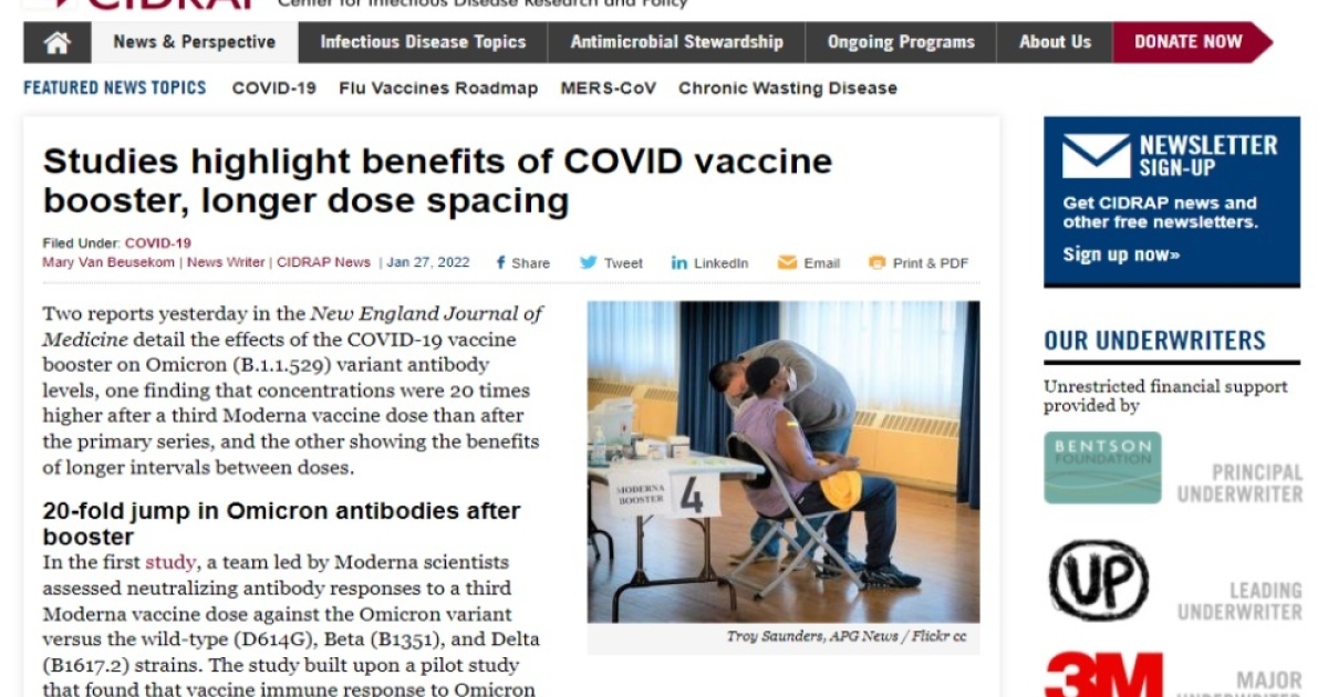 เมื่อวันที่ 27 ม.ค. ที่ผ่านมา วารสารทางการแพทย์นิวอิงแลนด์ ได้มีการเขียนรายงานถึงประสิทธิภาพของวัคซีนบูสเตอร์เพื่อใช้เพิ่มระดับสารภูมิคุ้มกันหรือแอนติบอดี้ต่อไวรัสโควิดสายพันธุ์โอไมครอน (B.1.1.529) โดยผลการศึกษาหนึ่งพบว่ามีการเพิ่มขึ้นของแอนติบอดีถึง 20 เท่าหลังจากที่ฉีดวัคซีนของบริษัทโมเดอร์นาเป็นโดสที่ 3 ตามมาหลังจากการฉีดวัคซีนหลักก่อนหน้านี้ และอีกผลการทดลองแสดงให้เห็นว่ามีประโยชน์ที่มากขึ้นถ้าหากมีการทิ้งระยะห่างระหว่างโดสให้นานขึ้น