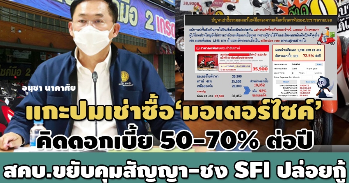 อย่างไรก็ตาม ในช่วง 2-3 เดือนที่ผ่านมา แม้รัฐบาลและภาครัฐ โดย สำนักงานคณะกรรมการคุ้มครองผู้บริโภค (สคบ.) จะพยายามเข้าไปกำกับดูแลอัตราดอกเบี้ย ‘สินเชื่อเช่าซื้อรถจักรยานยนต์’ โดยการกำหนดเพดานดอกเบี้ยไว้ที่ไม่เกิน 20% ต่อปี แต่ปรากฏว่า มีเสียงคัดค้านจากผู้ประกอบการในธุรกิจเช่าซื้อฯ