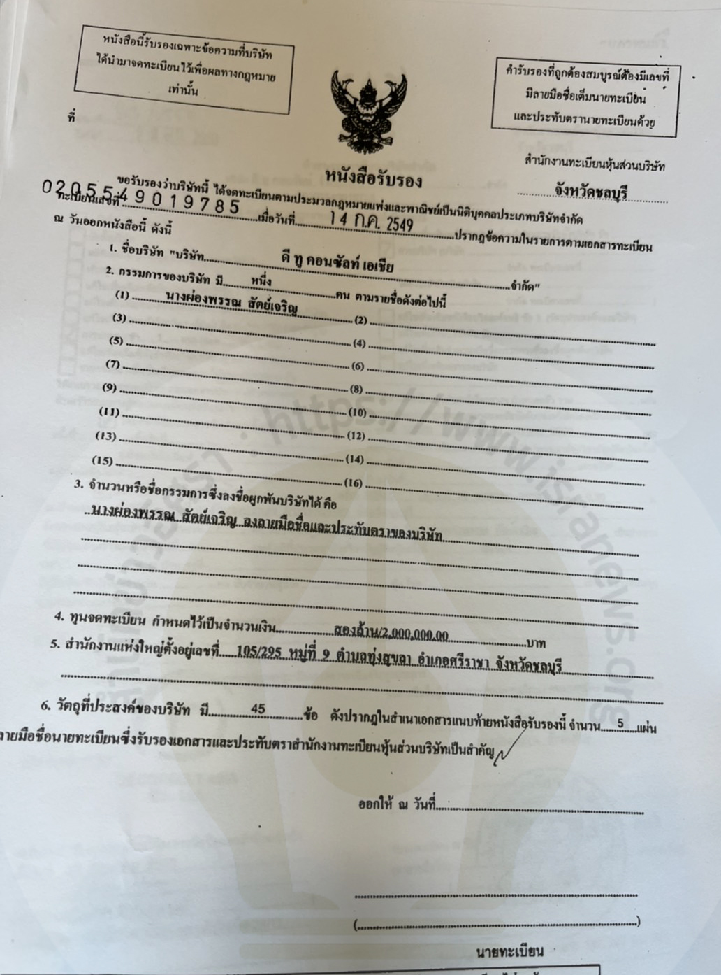 ส่วน นางผ่องพรรณ สัตย์เจริญ กรรมการบริษัท ดี ทูคอนซัลท์ เอเชีย จำกัด ในช่วงแรก เป็นผู้แจ้งจองชื่อตั้ง บริษัท อินฟราสตรักเจอร์ แอนด์ ทรานสปอร์เตชั่น ซิสเต็มส์ คอนซัลแตนซี กรุ๊ป (ประเทศไทย)