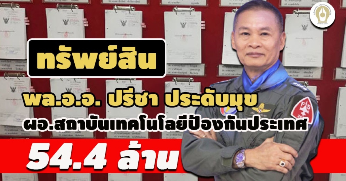 เปิดทรัพย์สิน พล.อ.อ. ปรีชา ประดับมุข ผู้อำนวยการสถาบันเทคโนโลยีป้องกันประเทศ 54.4 ล้านพร้อมภรรยา เก็บเงินสด 3 ล. ที่ดิน 86 ไร่ 20.1 ล. รถยนต์ 6 คัน นาฬิกา 28 เรือน 3 ล. หลังบ้าน สร้อยข้อมือ แหวนเพชร ต่างหูเพชร 16 ชิ้น แจ้งราคา 2 แสน รายได้ 5.9 ล.ต่อปี เงินเดือน 4.7 ล.