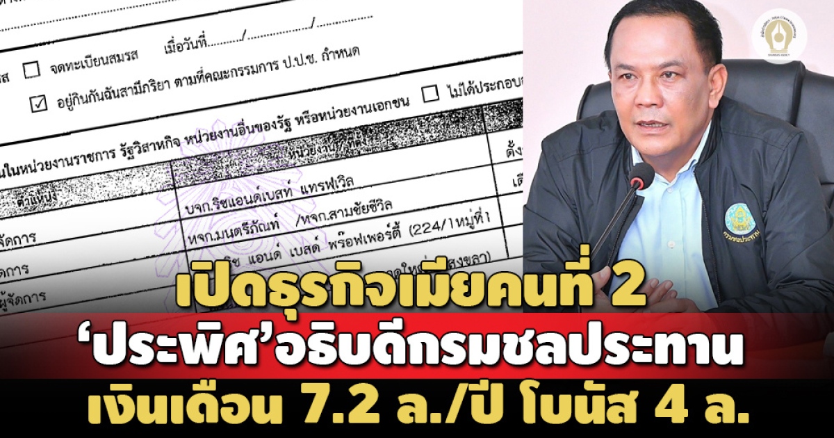 ทั้งนี้ นายประพิศแจ้งว่าภรรยาคนที่สองมีรายได้ต่อปีจากเงินเดือนบริษัท 7.2 ล้านบาท เงินโบนัสจากบริษัท 4 ล้านบาท