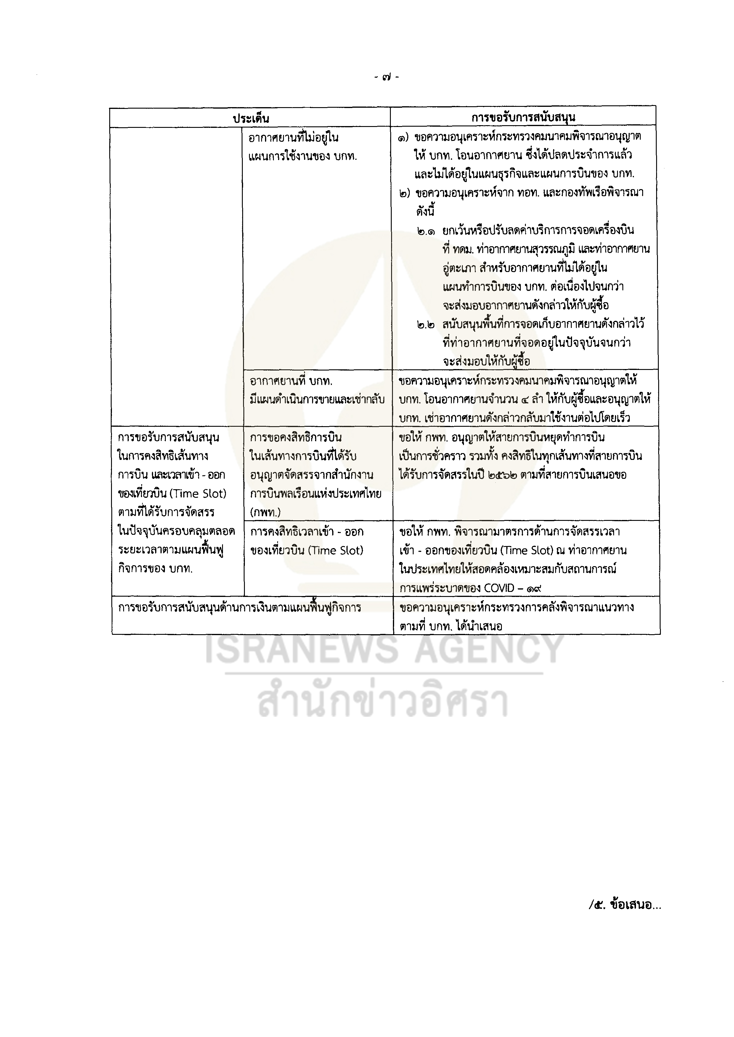 การขอรับการสนับสนุนในการคงสิทธิเส้นทาง และเวลาเข้า-ออกของเที่ยวบิน (Time Slot) ตามที่ได้รับการจัดสรรในปัจจุบันครอบคลุมตลอดระยะเวลาตามแผนฟื้นฟูกิจการของ กบท. ซึ่งประกอบด้วย 2 ประเด็น