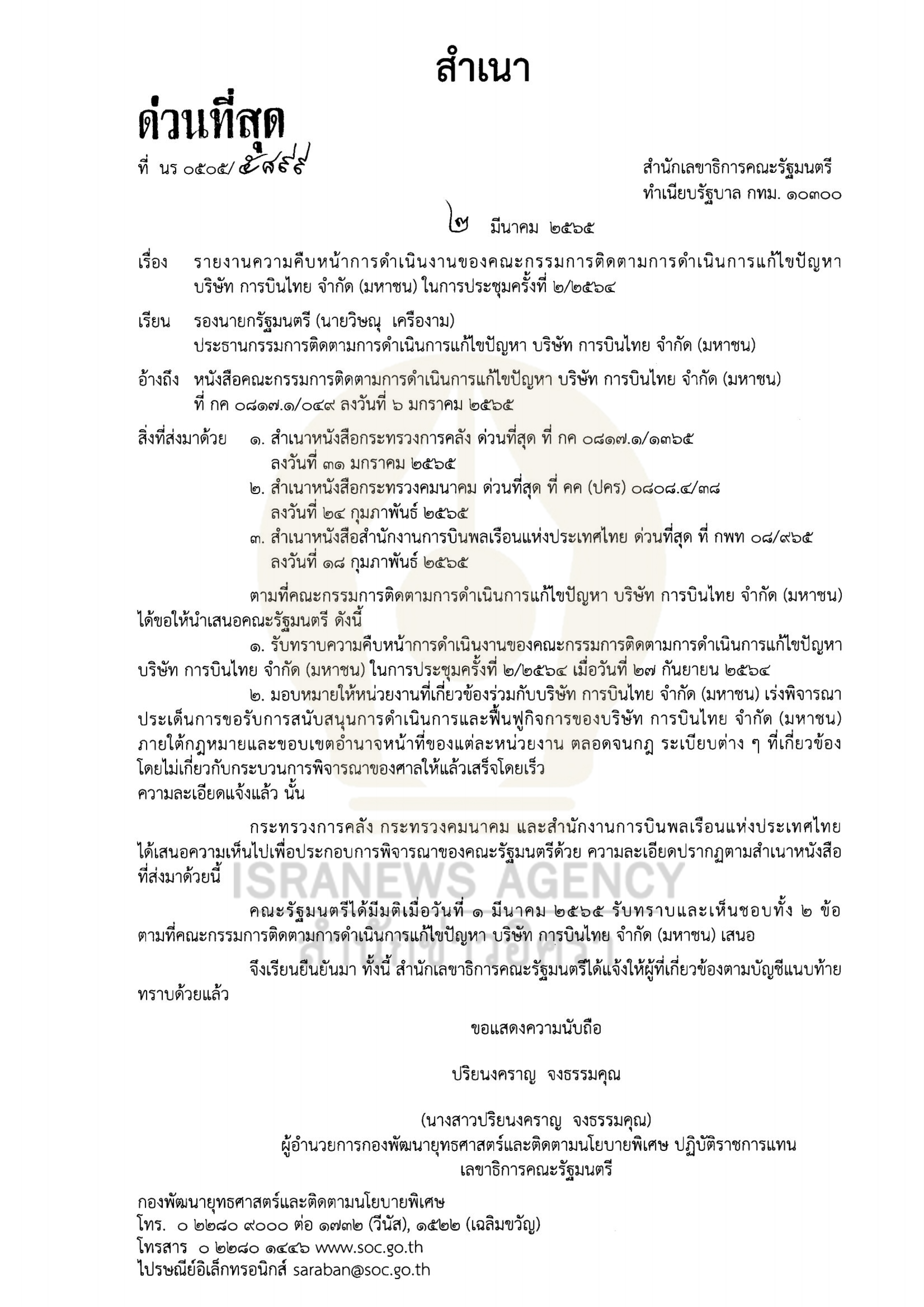 สืบเนื่องจากกรณีที่เมื่อวันที่ 1 มี.ค.ที่ผ่านมา ที่ประชุมคณะรัฐมนตรี (ครม.) มีมติรับทราบความคืบหน้าการดำเนินงานของคณะกรรมการติดตามการดำเนินการแก้ไขปัญหา บริษัท การบินไทย จำกัด (มหาชน) (อ่านประกอบ : 'การบินไทย' ลดกู้ 'เงินใหม่' เหลือ 2.5 หมื่นล้าน-'ครม.' รับทราบความคืบหน้าแผนฟื้นฟูฯ)