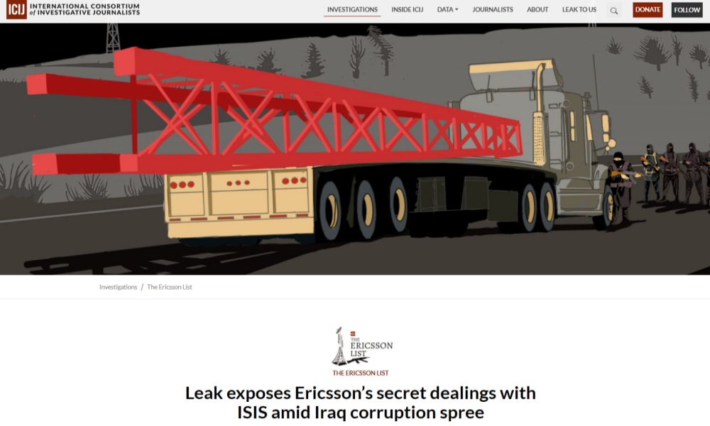 เว็บไซต์สมาคมผู้สื่อข่าวสืบสวนสอบสวนนานาชาติ หรือ ICIJ ได้รายงานข่าวซึ่งอ้างอิงจากการรวบรวมเอกสารว่าบริษัทโทรคมนาคมยักษ์ใหญ่อย่างอีริคสันนั้นได้มีการดำเนินการเพื่อคำขออนุมัติจากกลุ่มรัฐอิสลามเพื่อที่จะทำงานภายใต้พื้นที่และในเมืองที่ถูกครอบครองของกลุ่ม ISIS และพบข้อมูลว่าบริษัทนั้นยังได้มีการจ่ายเงินเพื่อแลกกับการขนอุปกรณ์เข้าไปยังพื้นที่ควบคุมของกลุ่ม ISIS ด้วยเช่นกัน