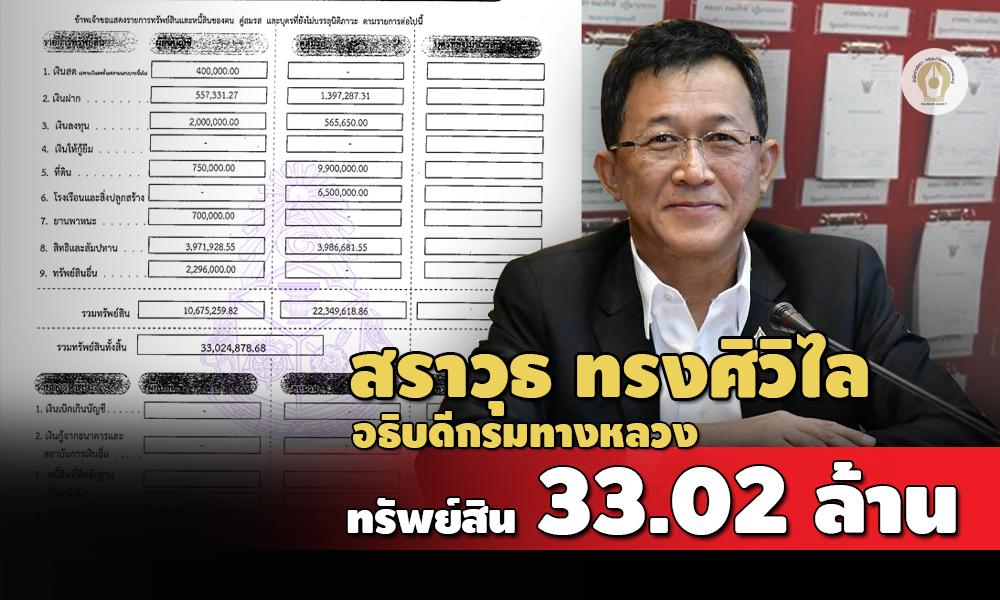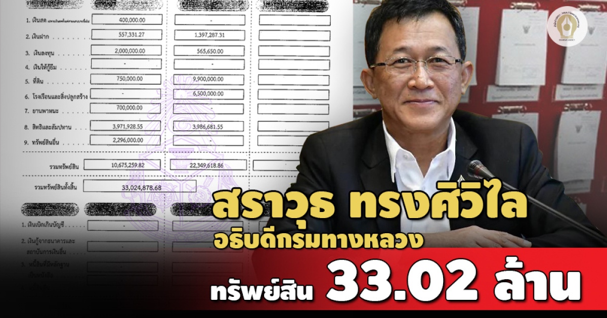 ทรัพย์สิน 33.02 ล้านบาท อธิบดีกรมทางหลวง 'สราวุธ ทรงศิวิไล' ถือเงินสด 4 แสนบาท พระเครื่อง-ภาพเขียน 1.8 ล้านบาท