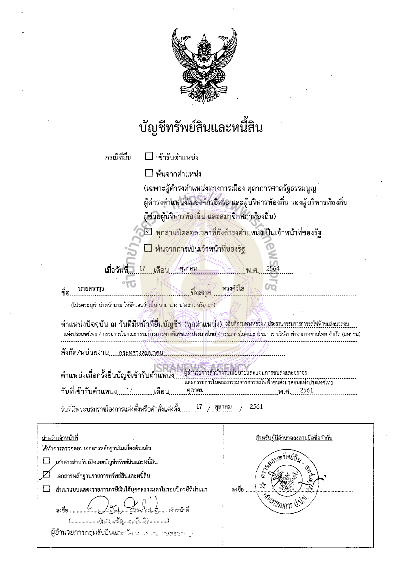 ผู้สื่อข่าวรายงานว่า เมื่อวันที่ 9 มี.ค.2565 สำนักงานคณะกรรมการป้องกันและปราบปรามการทุจริตแห่งชาติ (ป.ป.ช.) เปิดเผยบัญชีทรัพย์สินและหนี้สินและเอกสารประกอบของผู้ดำรงตำแหน่งระดับสูง รายของ นายสราวุธ ทรงศิวิไล อธิบดีกรมทางหลวง กรณีทุก 3 ปีตลอดเวลาที่ยังดำรงตำแหน่งเป็นเจ้าหน้าที่รัฐ เมื่อวันที่ 17 ต.ค.2564