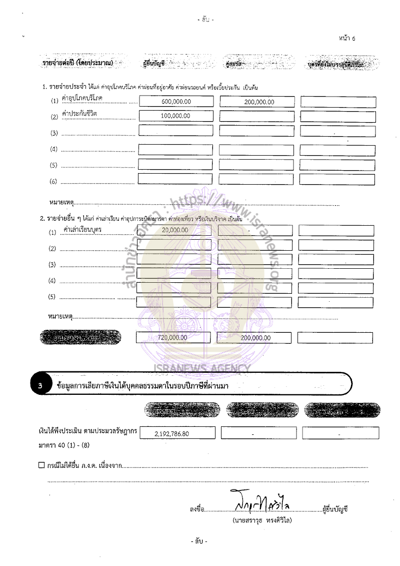 แจ้งมีรายจ่าย 720,000 บาท จากค่าอุปโภคบริโภค 600,000 บาท ค่าประกันชีวิต 100,000 บาท ค่าเล่าเรียนบุตร 20,000 บาท