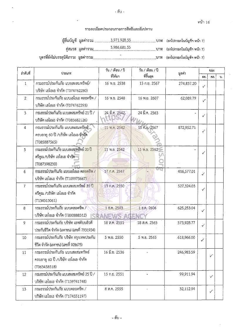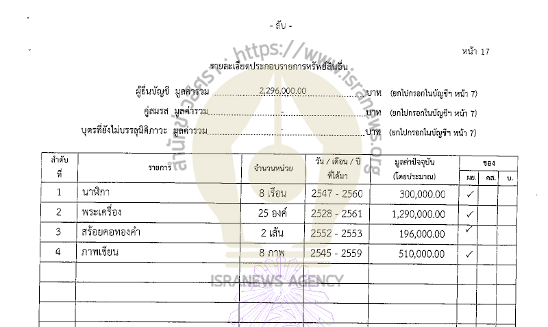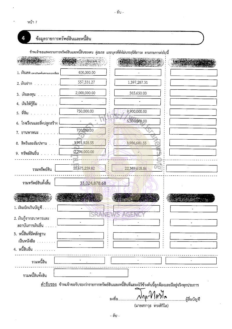 รวมทรัพย์สินทั้งสิ้น 33,024,878.68 บาท (เงินสด 400,000 บาท เงินฝาก 17 บัญชี 1,954,618.58 บาท ที่ดิน 7 แปลง 10,650,000 บาท) ไม่มีหนี้สิน