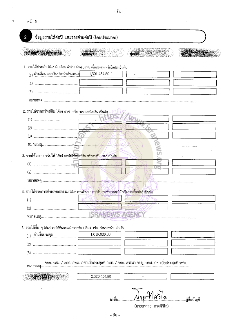 นายสราวุธ แจ้งมีรายได้ต่อปี 2,320,434.80 บาท จากเงินเดือนและเงินประจำตำแหน่ง 1,301,434.80 บาท ค่าเบี้ยประชุม 1,019,000 บาท