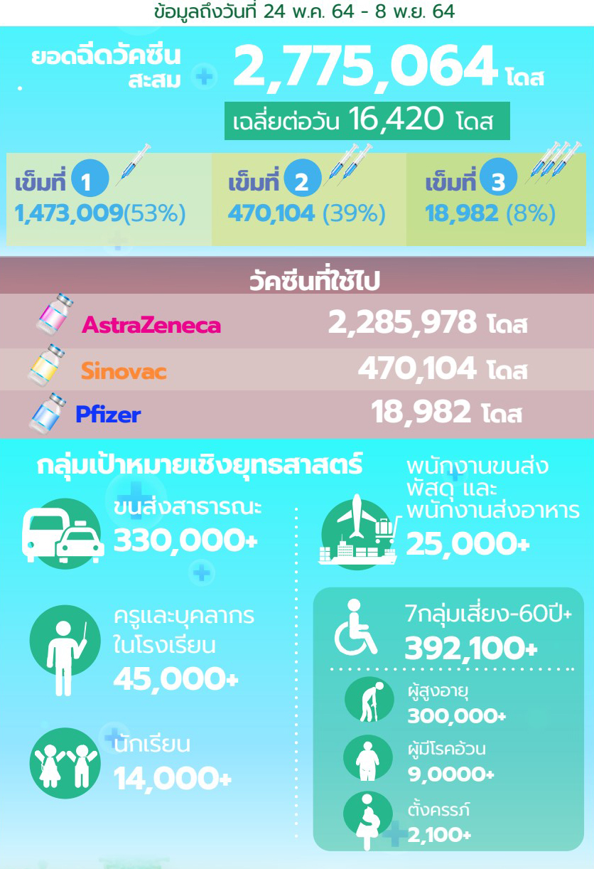 เมื่อพิจารณาตามชนิดของวัคซีน พบว่า มีการฉีดวัคซีนแอสตร้าเซนเนก้า (AstraZenaca) จำนวน 2,285,978 โดส วัคซีนซิโนแวค (Sinovac) จำนวน 470,104 โดส และวัคซีนไฟเซอร์ (Pfizer) ในกลุ่มนักเรียน จำนวน 18,982 โดส สามารถแบ่งการฉีดวัคซีนแก่ประชาชนตาม กลุ่มเป้าหมายเชิงยุทธศาสตร์ใน 5 กลุ่ม ดังนี้