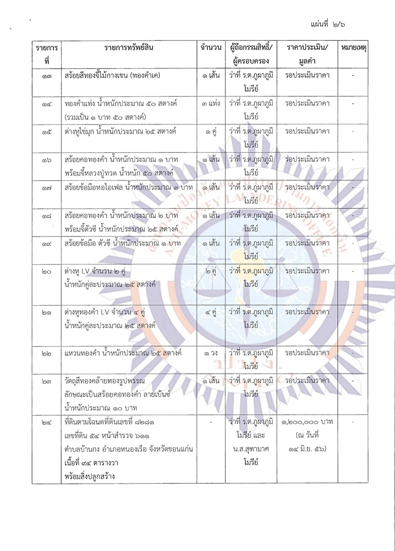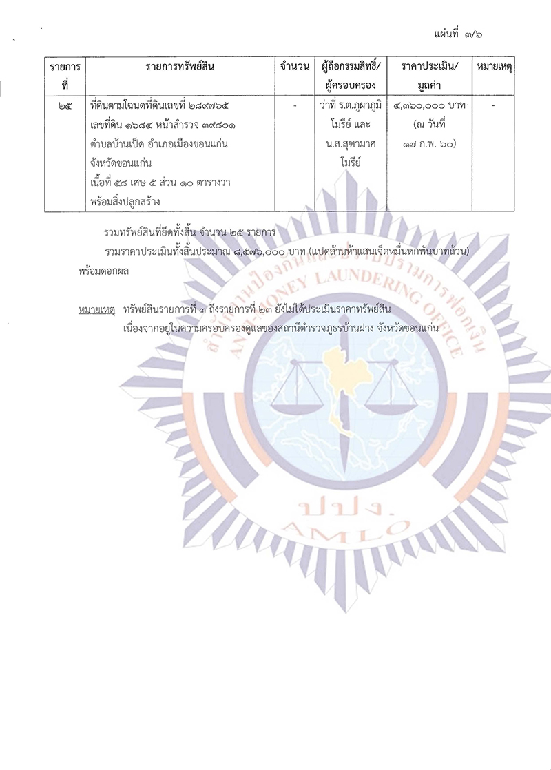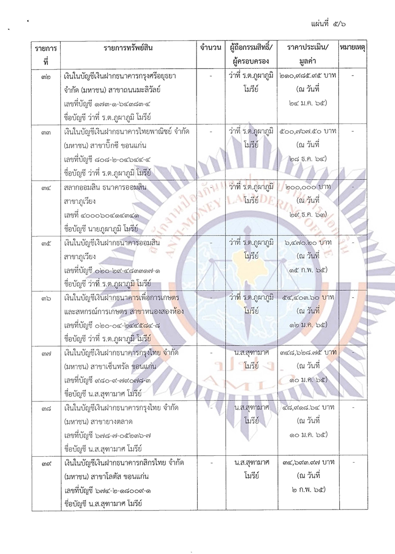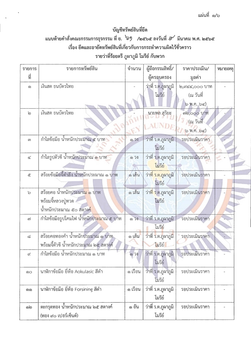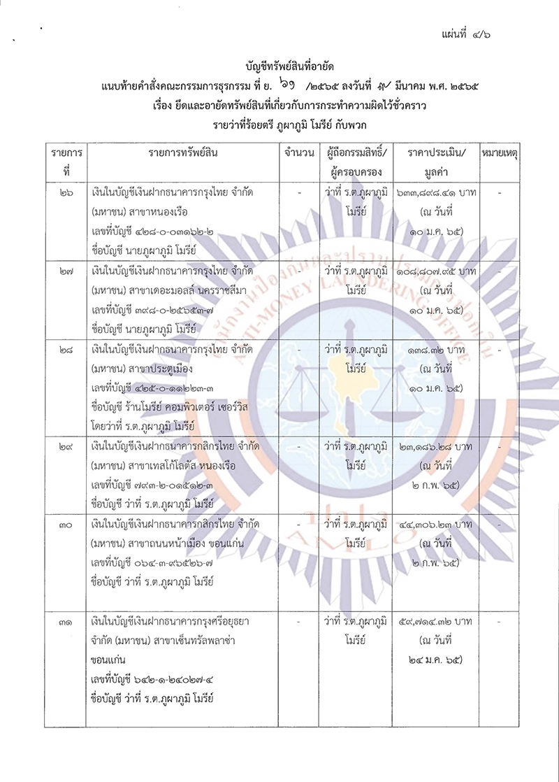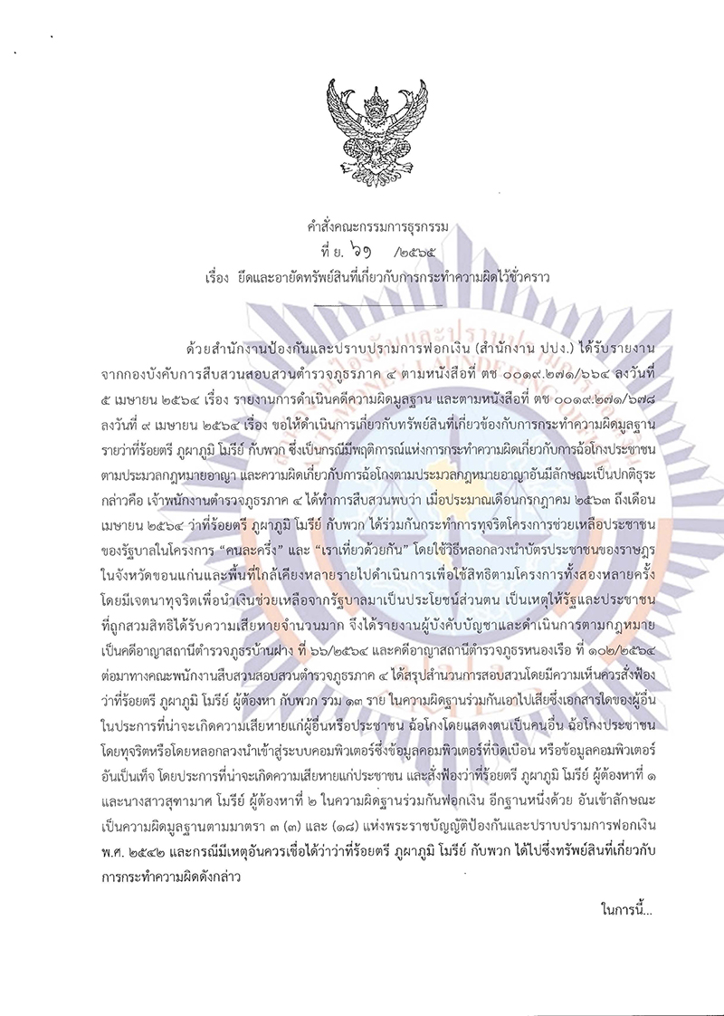 ในการนี้ เพื่อประโยชน์ในการปฏิบัติตามกฎหมายว่าด้วยการป้องกันและปราบปรามการฟอกเงิน ในการประชุมคณะกรรมการธุรกรรม ครั้งที่ 11/2564 เมื่อวันที่ 9 พฤศจิกายน 2564 ที่ประชุมมีมติ มอบหมายพนักงานเจ้าหน้าที่เพื่อดําเนินการตามพระราชบัญญัติป้องกันและปราบปรามการฟอกเงิน พ.ศ. 2542 ประกอบกับคําสั่งเลขาธิการคณะกรรมการป้องกันและปราบปรามการฟอกเงิน ลับ ที่ ม.647/2564 ลงวันที่ 3 ธันวาคม 2564 เรื่อง มอบหมายพนักงานเจ้าหน้าที่ตรวจสอบธุรกรรมหรือทรัพย์สินที่เกี่ยวกับการกระทําความผิด รายว่าที่ร้อยตรี ภูผาภูมิ โมรีย์ กับพวก พนักงานเจ้าหน้าที่ได้ดําเนินการตรวจสอบรายงานการทําธุรกรรมหรือข้อมูล เกี่ยวกับการทําธุรกรรมของบุคคลดังกล่าวแล้ว ปรากฏหลักฐานเป็นที่เชื่อได้ว่า ว่าที่ร้อยตรี ภูผาภูมิ โมรีย์ กับพวก มีพฤติการณ์แห่งการกระทําอันเข้าลักษณะเป็นความผิดมูลฐานตามมาตรา 3 (3) และ (18) แห่งพระราชบัญญัติ ป้องกันและปราบปรามการฟอกเงิน พ.ศ. 2542 หรือเป็นผู้ซึ่งเกี่ยวข้องหรือเคยเกี่ยวข้องสัมพันธ์กับผู้กระทํา ความผิดมูลฐานหรือความผิดฐานฟอกเงิน และจากการตรวจสอบข้อมูลการทําธุรกรรมหรือทรัพย์สินที่เกี่ยวกับ การกระทําความผิด รวมทั้งจากการรวบรวมพยานหลักฐาน ปรากฏว่าบุคคลดังกล่าวได้ไปซึ่งทรัพย์สินที่เกี่ยวกับ การกระทําความผิด จํานวน 41 รายการ พร้อมดอกผล และเนื่องจากทรัพย์สินที่เกี่ยวกับการกระทําความผิด ในคดีนี้ประกอบด้วยสังหาริมทรัพย์ประเภทเงินสด อันเป็นทรัพย์สินที่มีสภาพคล่อง สามารถปกปิด ซ่อนเร้น หรือโอนเปลี่ยนมือได้โดยง่าย สังหาริมทรัพย์ประเภทเงินในบัญชีเงินฝากธนาคาร และสลากออมสิน อันเป็นทรัพย์สิน ที่สามารถโอน ยักย้าย ปกปิด หรือซ่อนเร้นได้โดยง่าย และสังหาริมทรัพย์ประเภททองรูปพรรณ และเครื่องประดับ อันเป็นทรัพย์สินที่ไม่ปรากฏหลักฐานในทางทะเบียน โดยเจ้าของหรือผู้ครอบครองสามารถโอน จําหน่าย ยักย้าย ปกปิด หรือซ่อนเร้นได้โดยง่าย และเป็นอสังหาริมทรัพย์ประเภทที่ดิน และสิ่งปลูกสร้าง อันเป็นทรัพย์สิน ที่ปรากฏหลักฐานในทางทะเบียน ในการเป็นผู้ถือกรรมสิทธิ์หรือผู้มีสิทธิครอบครองโดยผู้มีชื่อเป็นเจ้าของกรรมสิทธิ์ หรือผู้มีสิทธิครอบครองอาจดําเนินการทางนิติกรรมโอนเปลี่ยนแปลงชื่อผู้ถือกรรมสิทธิ์หรือผู้มีสิทธิครอบครอง ในทางทะเบียนได้ หากมิได้มีการออกคําสั่งให้ยึดและอายัดทรัพย์สินดังกล่าวไว้ชั่วคราว เมื่อเจ้าของหรือผู้มีส่วนได้เสีย หรือผู้มีสิทธิในทรัพย์สินดําเนินการโอน จําหน่าย ยักย้าย ปกปิด หรือซ่อนเร้นทรัพย์สินดังกล่าวไปเ