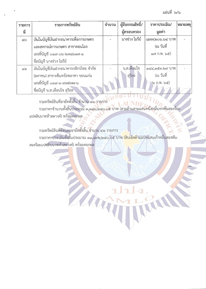 อาศัยอํานาจตามความในมาตรา 34(3) และมาตรา 48 วรรคหนึ่ง แห่งพระราชบัญญัติ ป้องกันและปราบปรามการฟอกเงิน พ.ศ. 2542 และที่แก้ไขเพิ่มเติม มติคณะกรรมการธุรกรรมในการประชุม ครั้งที่ 3/2565 เมื่อวันที่ 8 มีนาคม 2565 และระเบียบคณะกรรมการธุรกรรม ว่าด้วยการรับเรื่อง การตรวจสอบ การพิจารณาดําเนินการ และการควบคุมตรวจสอบการปฏิบัติงานของพนักงานเจ้าหน้าที่ ตามกฎหมายว่าด้วยการป้องกันและปราบปรามการฟอกเงิน พ.ศ. 2556 ข้อ 25 คณะกรรมการธุรกรรม จึงมีคําสั่งยึดและอายัดทรัพย์สินที่เกี่ยวกับการกระทําความผิดไว้ชั่วคราว จํานวน 41 รายการ พร้อมดอกผล กล่าวคือ มีคําสั่งให้ยึดทรัพย์สิน จํานวน 25 รายการ ได้แก่ รายการที่ 1 ถึงรายการที่ 25 และมีคําสั่งให้อายัดทรัพย์สิน จํานวน 16 รายการ ได้แก่ รายการที่ 26 ถึงรายการที่ 41 มีกําหนดไม่เกิน 90 วัน (เก้าสิบวัน) นับตั้งแต่วันที่คณะกรรมการธุรกรรมมีมติ กล่าวคือ นับตั้งแต่วันที่ 8 มีนาคม 2565 ถึงวันที่ 5 มิถุนายน 2565 โดยมีรายการทรัพย์สินที่ยึดและอายัดปรากฏตามบัญชีทรัพย์สินแนบท้ายคําสั่งนี้