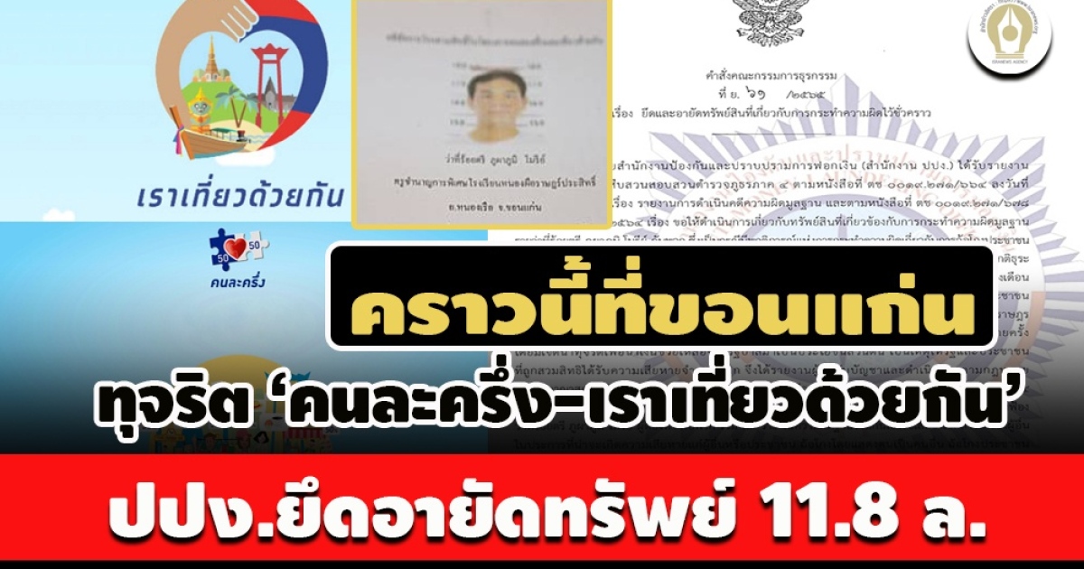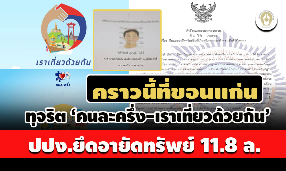 อีกคดี! ปปง.ยึดอายัดทรัพย์ ก๊วนทุจริตโครงการ ‘คนละครึ่ง-เราเที่ยวด้วยกัน’ ว่าที่ร้อยตรี ภูผาภูมิ โมรีย์ กับพวก หลอกเอาบัตรประชาชนไปใช้สิทธิเหตุเกิดที่ จ.ขอนแก่น พื้นที่ใกล้เคียง ทรัพย์สินลอตแรก 41 รายการ เบื้องต้น 11.8 ล.นอกจากคดีทุจริตโครงการ “เราเที่ยวด้วยกัน” กรณี โรงแรม จ.ชัยภูมิ ล่าสุดเป็นกรณีทุจริตโครงการ “คนละครึ่ง” และ “เราเที่ยวด้วยกัน” ใน จ.ขอนแก่นแลพื้นที่ใกล้เคียง ถูก ปปง.ยึดและอายัดทรัพย์สินผู้เกี่ยวข้องอีกคดี