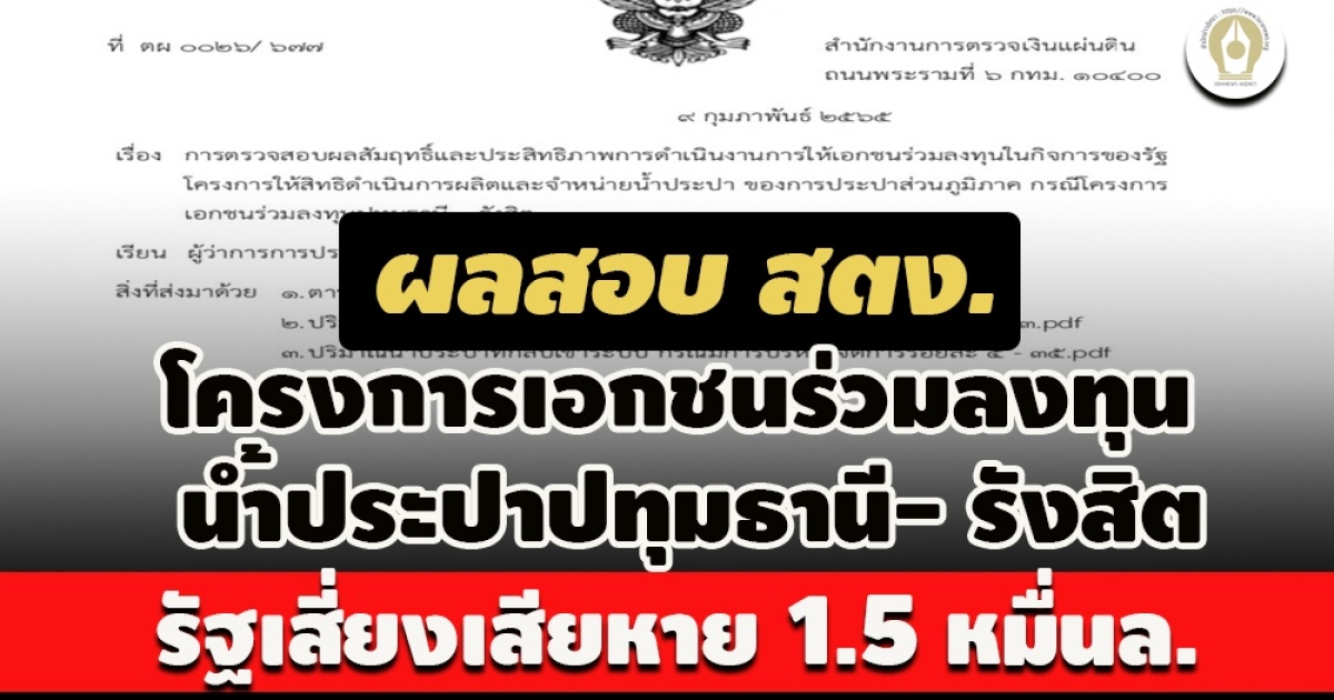 ทั้งนี้ ในหนังสือ สตง. ระบุว่า ผู้ว่าการตรวจเงินแผ่นดิน โดยสำนักตรวจสอบการดำเนินงานที่ 5 ได้ตรวจสอบผลสัมฤทธิ์และประสิทธิภาพการดำเนินงานการให้เอกชนร่วมลงทุนในกิจการของรัฐ โครงการให้สิทธิดำเนินการผลิตและจำหน่ายน้ำประปา ของการประปาส่วนภูมิภาค กรณีโครงการเอกชนร่วมลงทุนปทุมธานี - รังสิต เสร็จแล้ว