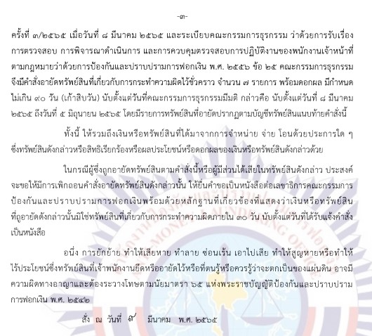 อาศัยอํานาจตามความในมาตรา 34 (3) และมาตรา 48 วรรคหนึ่ง แห่งพระราชบัญญัติ ป้องกันและปราบปรามการฟอกเงิน พ.ศ. 2542 และที่แก้ไขเพิ่มเติม มติคณะกรรมการธุรกรรมในการประชุมครั้งที่ 3/2565 เมื่อวันที่ 8 มีนาคม 2565 และระเบียบคณะกรรมการธุรกรรม ว่าด้วยการรับเรื่อง การตรวจสอบ การพิจารณาดําเนินการ และการควบคุมตรวจสอบการปฏิบัติงานของพนักงานเจ้าหน้าที่ ตามกฎหมายว่าด้วยการป้องกันและปราบปรามการฟอกเงิน พ.ศ. 2556 ข้อ 25 คณะกรรมการธุรกรรม จึงมีคําสั่งอายัดทรัพย์สินที่เกี่ยวกับการกระทําความผิดไว้ชั่วคราว จํานวน 7 รายการ พร้อมดอกผล มีกําหนด ไม่เกิน 90 วัน (เก้าสิบวัน) นับตั้งแต่วันที่คณะกรรมการธุรกรรมมีมติ กล่าวคือ นับตั้งแต่วันที่ 8 มีนาคม 2565 ถึงวันที่ 5 มิถุนายน 2565 โดยมีรายการทรัพย์สินที่อายัดปรากฏตามบัญชีทรัพย์สินแนบท้ายคําสั่งนี้