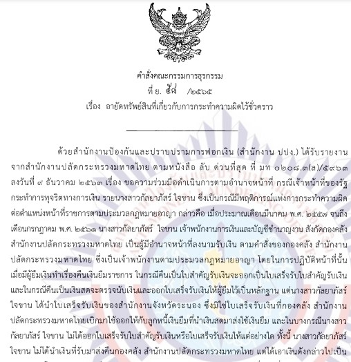 เปิดคำสั่ง คกก. ธุรกรรม ปปง. ดูความเป็นมา-พฤติกรรม คดีเจ้าหน้าที่การเงินฯ กองคลัง สำนักงานปลัดมหาดไทย ยักยอกเงิน ‘ยืมราชการ’ ไม่ส่งคืนหน่วยงานต้นสังกัด เบียดบังเข้าส่วนตัว เสียหาย 19.9 ล. ก่อนถูกแจ้งความ สั่งไล่ออก ตามยึดทรัพย์ซ้ำ